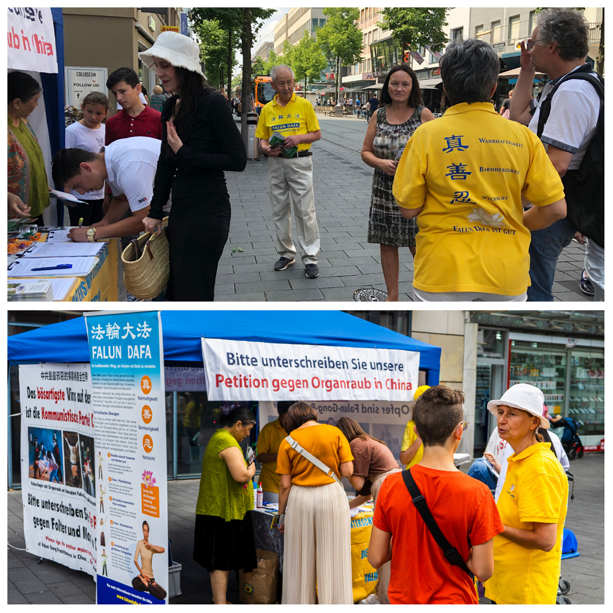 学员还告诉阿妮特:我们今天在这里,就是要呼吁早日停止迫害。学员还告诉她,上周末在柏林法轮功学员举办了大型反迫害的游行活动。网上可以找到很多有关的视频和文章报道。阿妮特说:“太好了。你可以把网址写在这张传单上面吗?”学员随即把de.d2s3ombhnov3zf.cloudfront.net,de.falundafa.org 写在了上面。