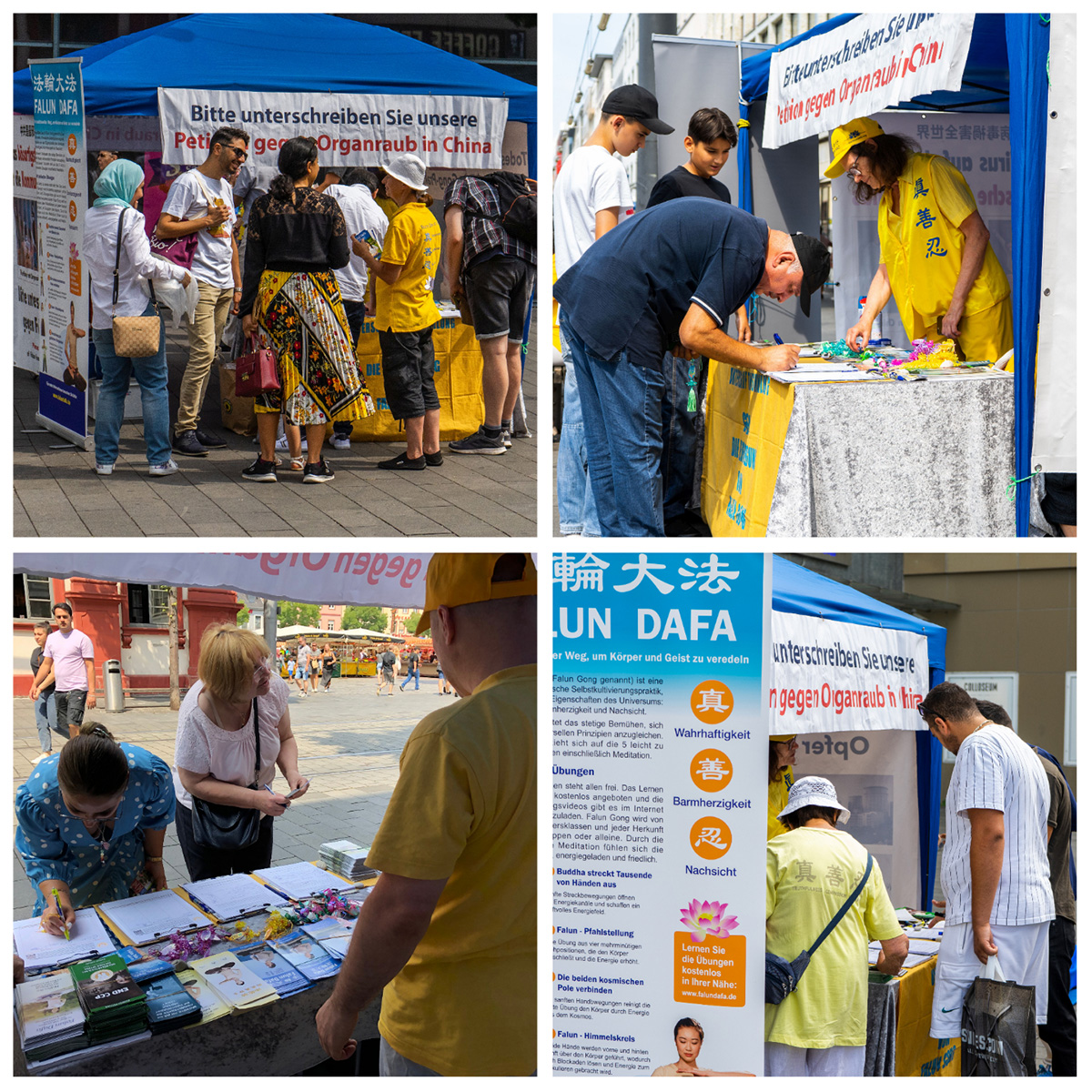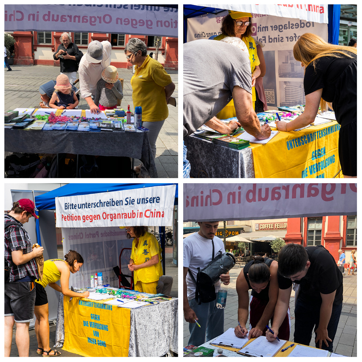 当天,学员们搭好真相展板后,有的演示功法,有的发放真相传单。宁静优雅的场面和周围喧闹的气氛形成了鲜明的对比。展台左右两侧分别悬挂着的“活摘器官 天理不容”、“中共是最邪恶的病毒祸害全世界”大型横幅也格外的引人注目。路人纷纷停下了匆忙的脚步,认真观察、仔细的阅读着。有的和学员攀谈、询问着。有市民送来西瓜感谢学员的付出,也有的表示要学功。很多路人以签名的方式表示支持法轮功学员反迫害,并鼓励学员要坚持下去