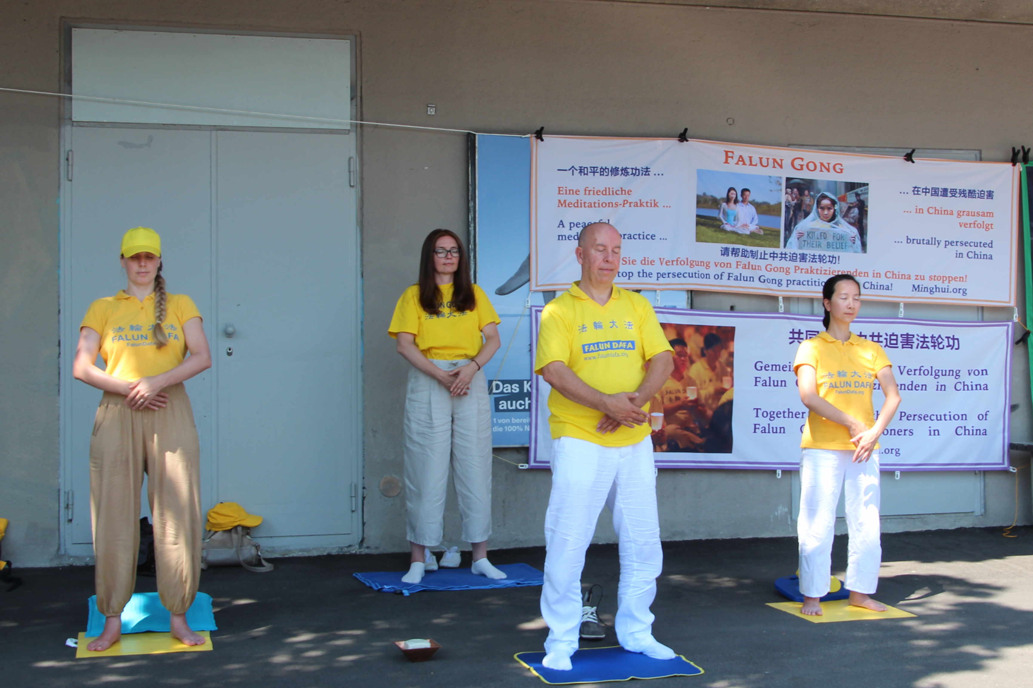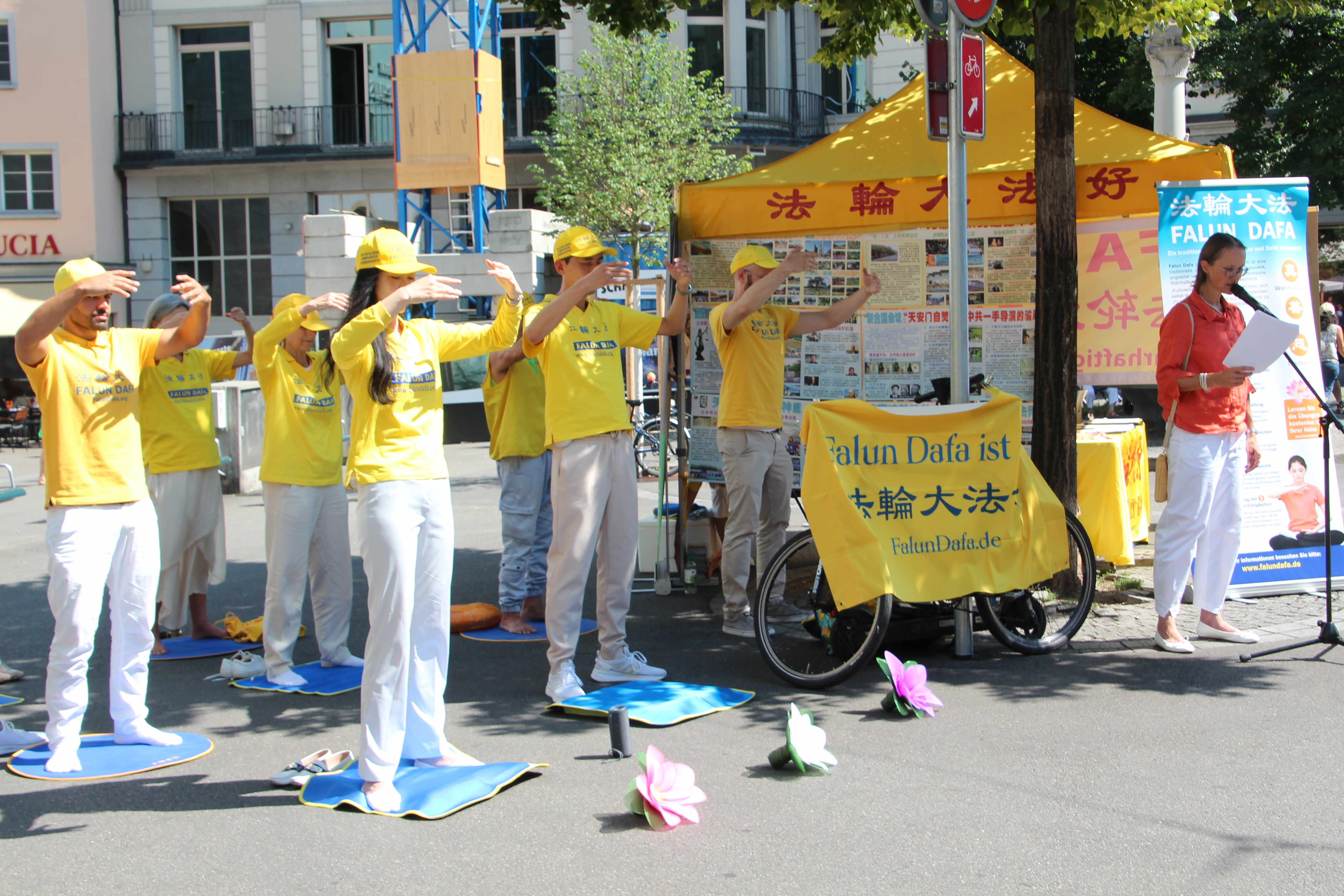 ![]() 图2:法轮功学员在苏黎世市中心演示功法,并通过演讲介绍法轮功 |