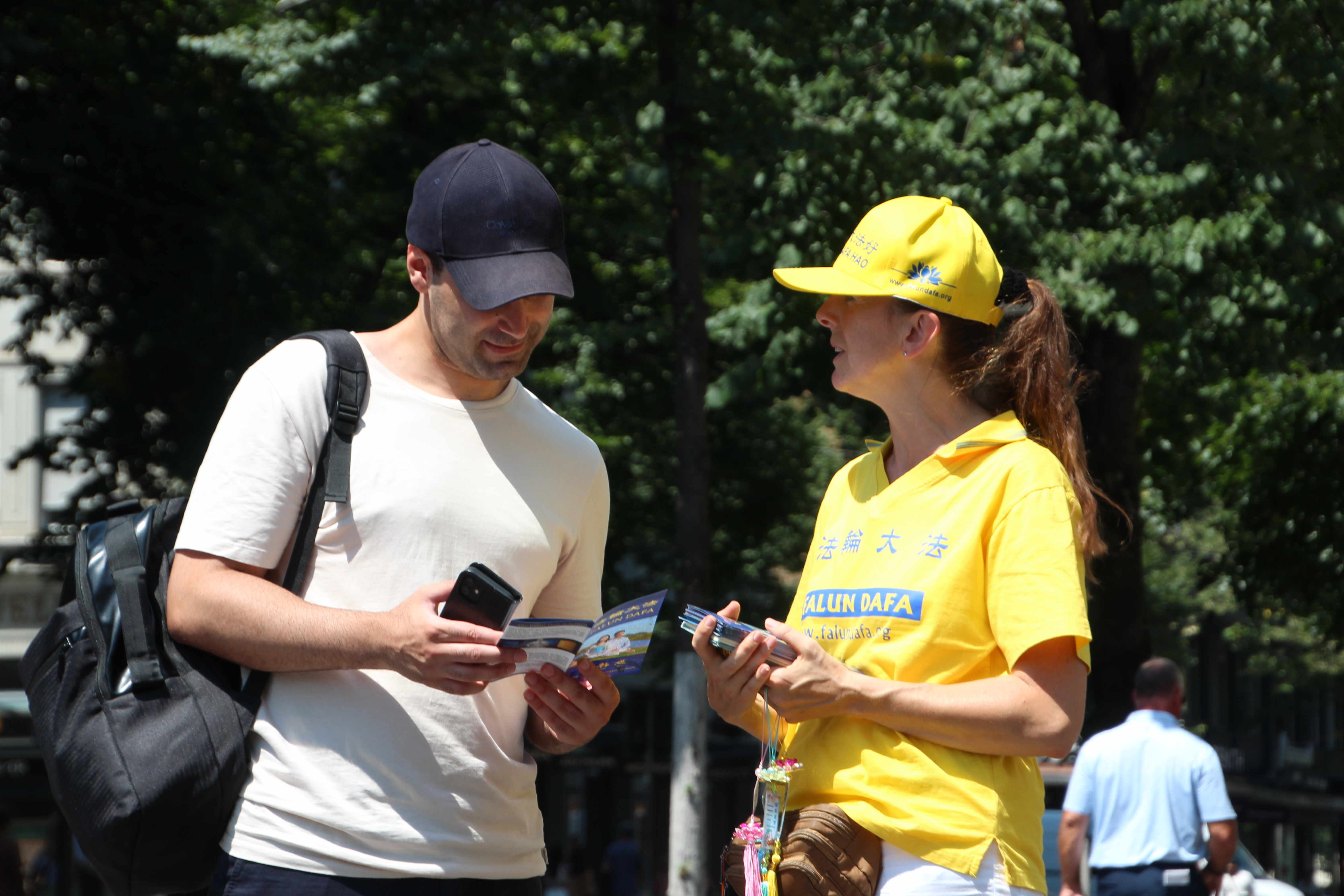 “这条街上人们在忙于购物,你们(法轮功学员)在这里非常引人注目,如此平和,非常打动人,谢谢你们,请继续坚持下去。”来自委内瑞拉的伊莲娜·诺伊曼(Ilena Neumann)也是在电车上看到了在苏黎世市中心的熙熙攘攘中静静打坐的法轮功学员,她也同样下了电车,找到法轮功学员的信息摊位,想了解更多讯息。