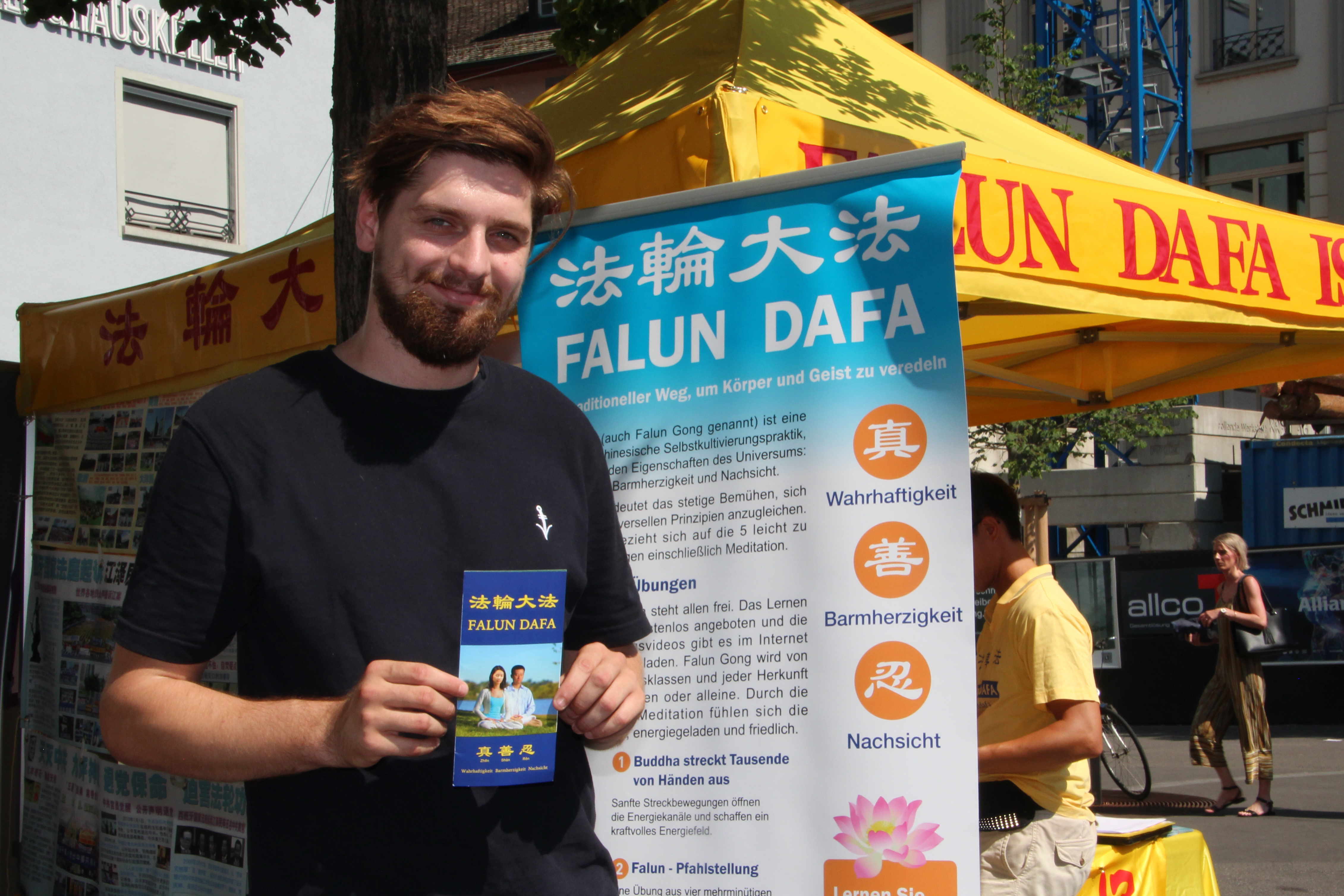 在法轮功学员在苏黎世市中心的集会上他当即签名支持法轮功学员。他谈到自己对法轮功:“有非常正面的印象。(法轮功中的)打坐让人感到平静,获取能量,对精神也很有好处。”