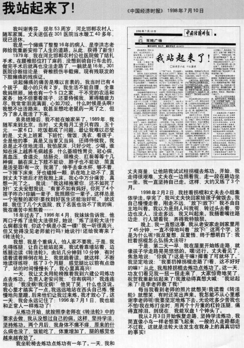 一九九八年七月十日,《中国经济时报》刊登了一篇题为“我站起来了”的报道。主人公谢秀芬在一次医疗事故中,脊椎损伤半截瘫痪,整整瘫痪了十六年,修炼法轮功仅三个月就奇迹般站起来了。时年五十三岁的谢秀芬高兴地说:“我简直像小鸟一样老想要飞起来,一般的人走路都走不过我。这就是法轮大法发生在我身上的真真切切的事实!”