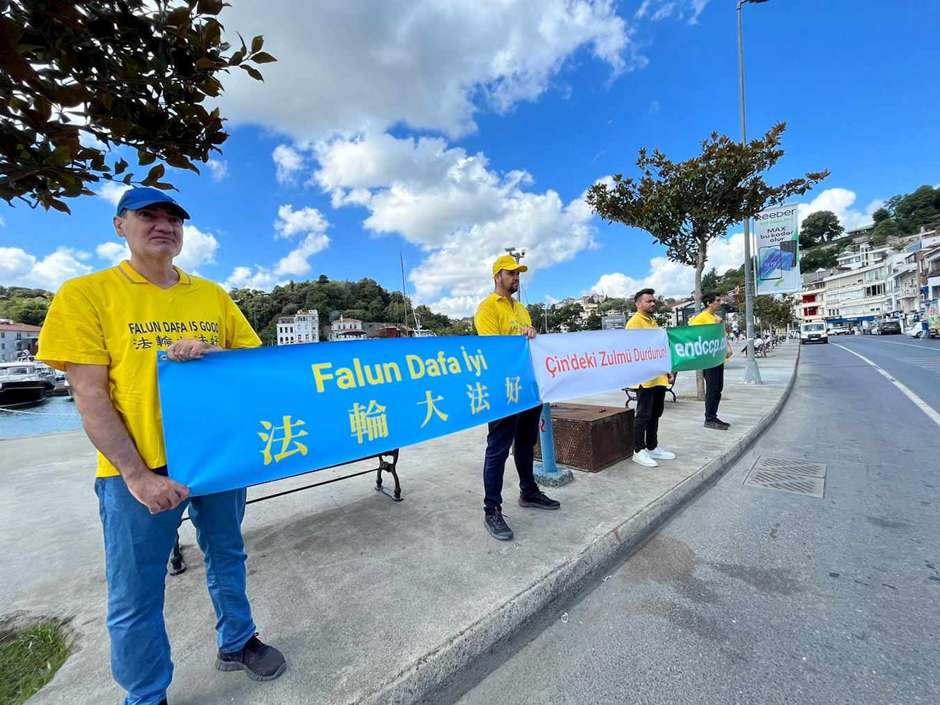 ![]() 图1:二零二二年七月二十日,土耳其的法轮功学员聚集在伊斯坦布尔中领馆附近和平请愿,谴责中共对法轮功学员长达二十三年的迫害。学员们面向街道举着横幅,许多路过的司机纷纷鸣笛鼓掌,表达支持。 |