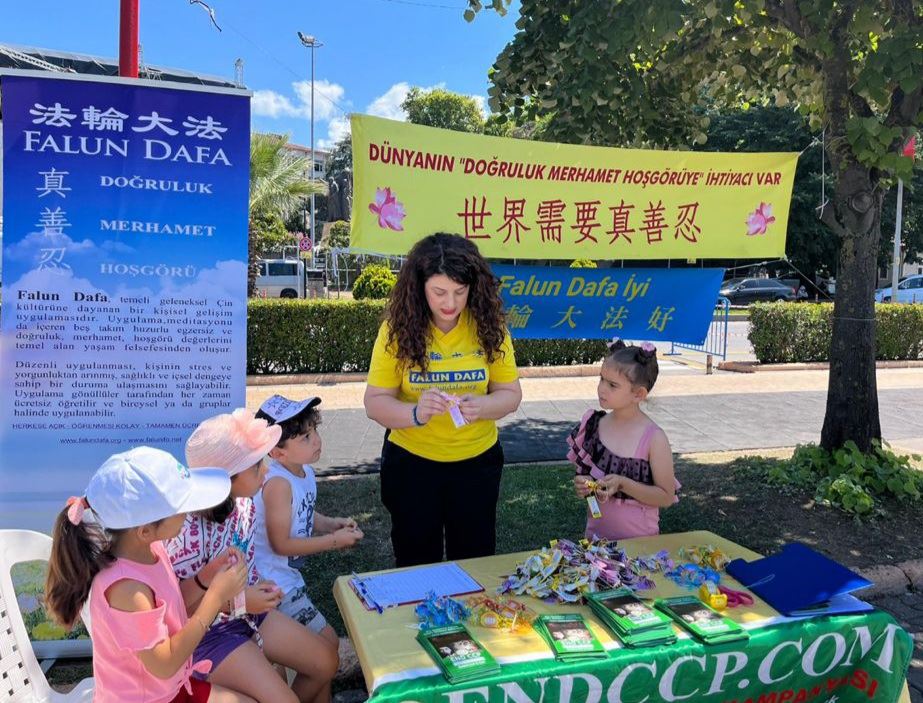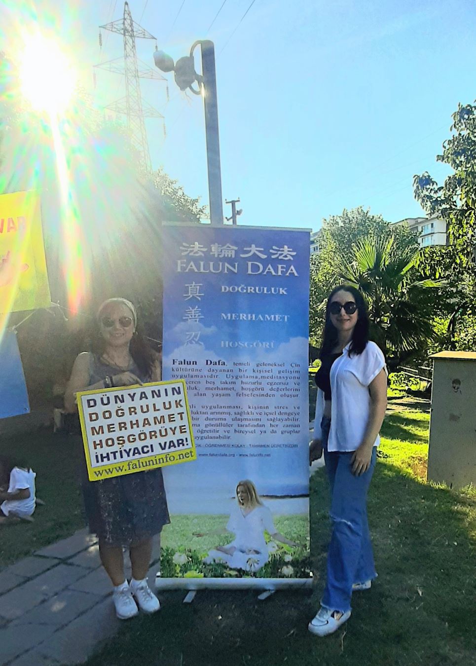 住在埃雷利的阿斯利(Aslı)女士来到法轮功学员的展位,说,当听到法轮功学员会来参加这个活动时,她非常高兴,她已经在活动区域找学员找了两天。
