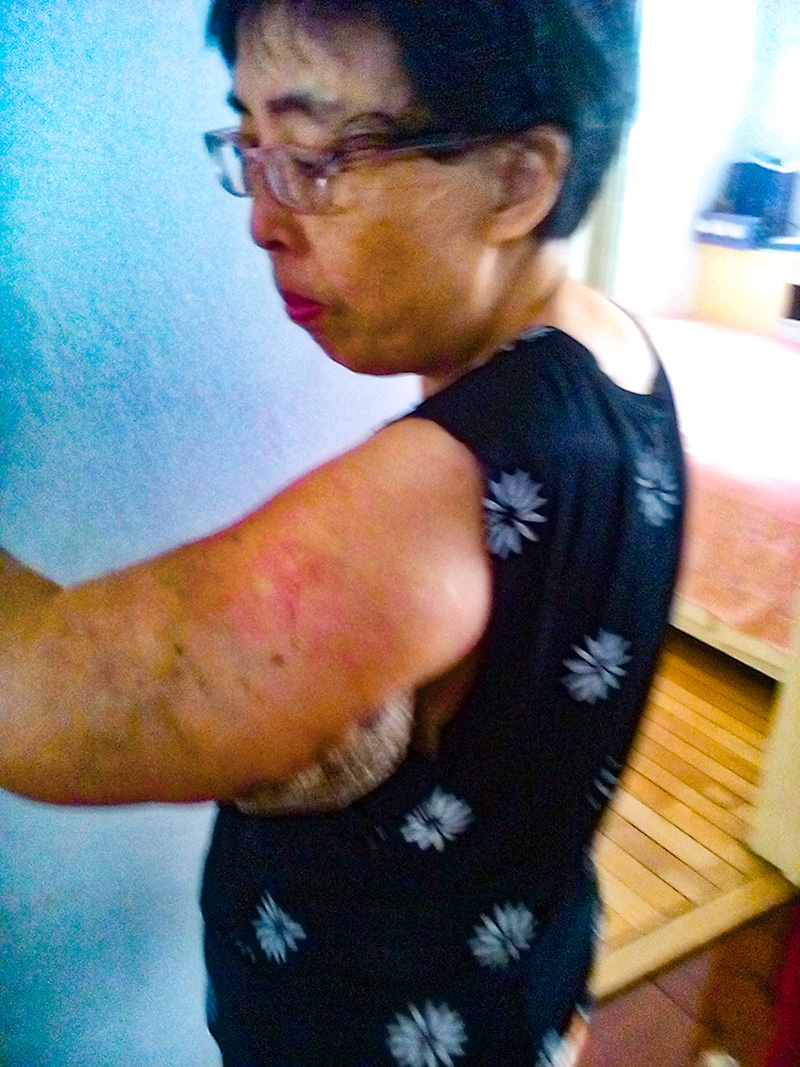 范凤珍在劳教所被放出来时,家人带她去医院,医生说她活不了多长时间了。她在劳教所遭受电棍电击等酷刑折磨,左胳膊下有一个很大的瘤子,严重时,双腿、肚子,都肿硬,左手肿的像个小馒头,左胳膊一直肿着(见照片)。用她的话讲:每天都在和死神抗争。二十年来,如果没有修炼大法,她不会有这么顽强的毅力,不会在这种痛苦的折磨中走到今天的。