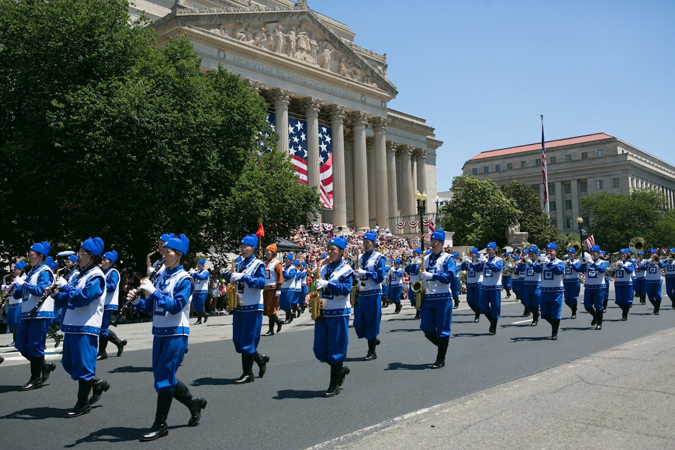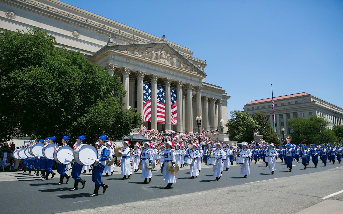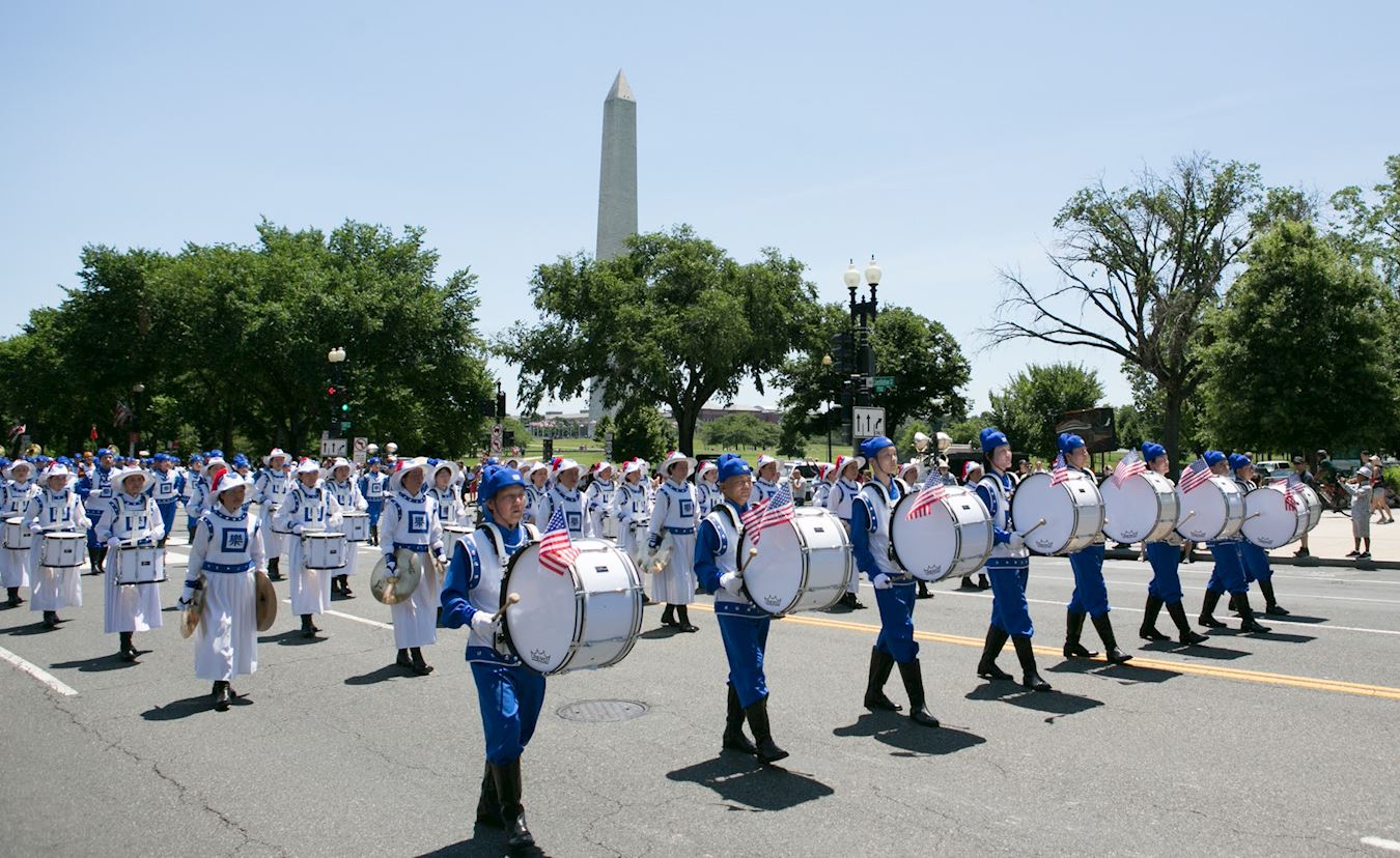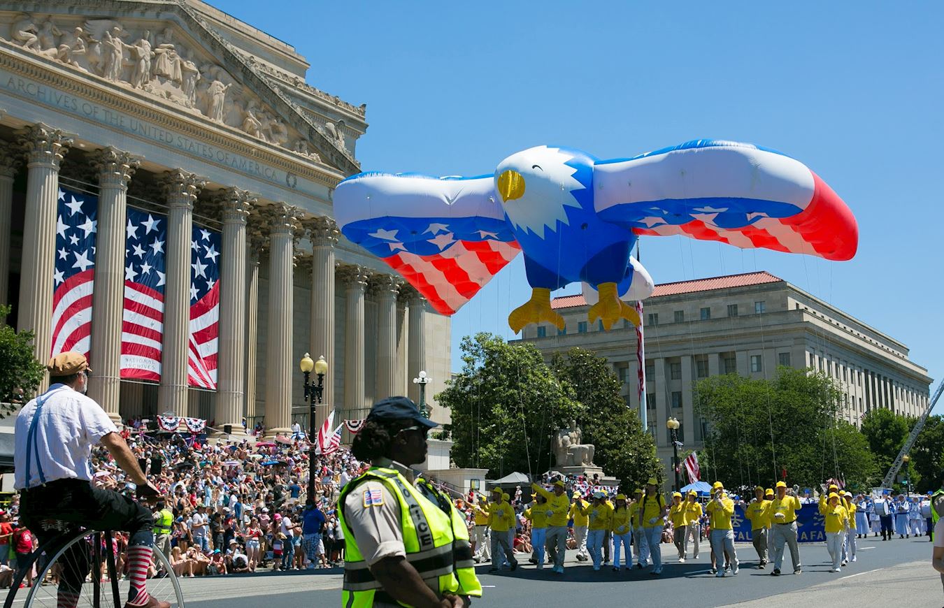 今年是天国乐团第十五年入选美国独立日游行,也是唯一受邀参加游行的华人军乐队。法轮功学员受主办方之邀手持雄鹰大气球。法轮功学员设计制作的花车别具一格,“法轮大法好”、“真善忍”镶嵌在花车两侧,车头以蓝天白云和飞天仙女装饰,车尾装饰一朵盛开的莲花,几位青年法轮功学员在花车上展示功法。