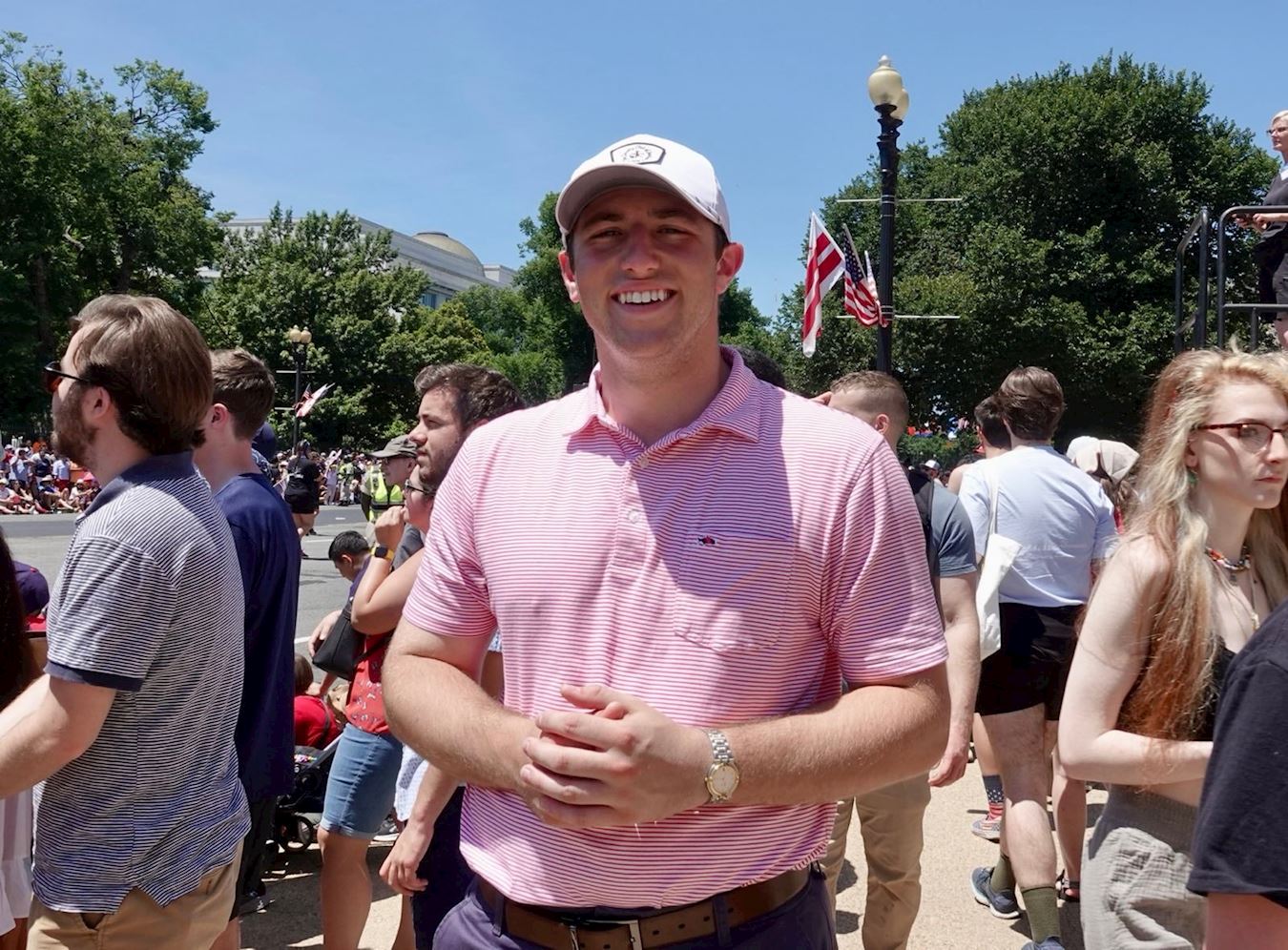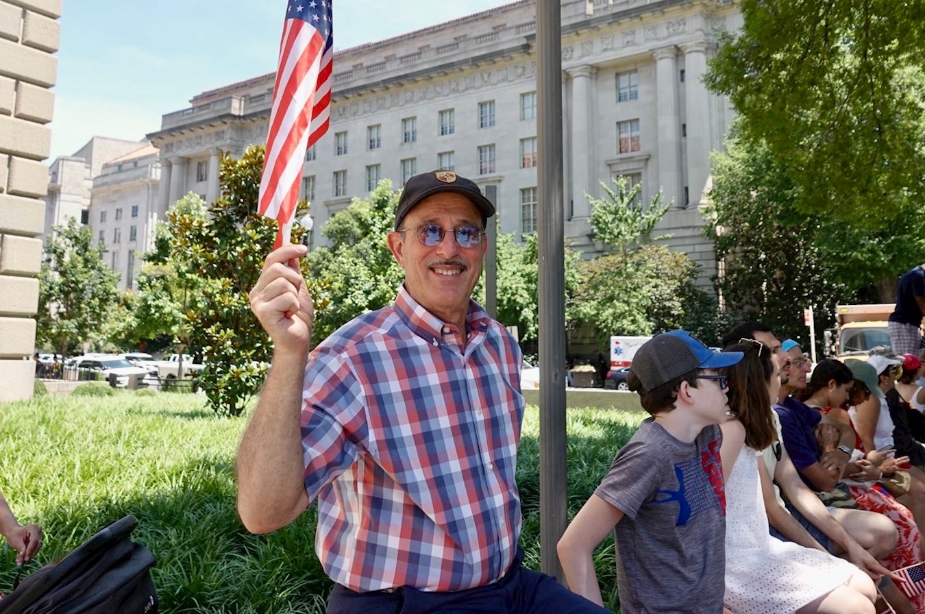 来自北卡罗莱纳的内科医生斯蒂芬·克里斯曼(Stephen Krisman)第一次在华盛顿DC观看国庆日游行。他不停地挥动着手中的国旗,他说,美国是人类历史上唯一建立在把信仰自由作为最高理想的国度,七月四号就是在庆祝美国这一最伟大的理念。
