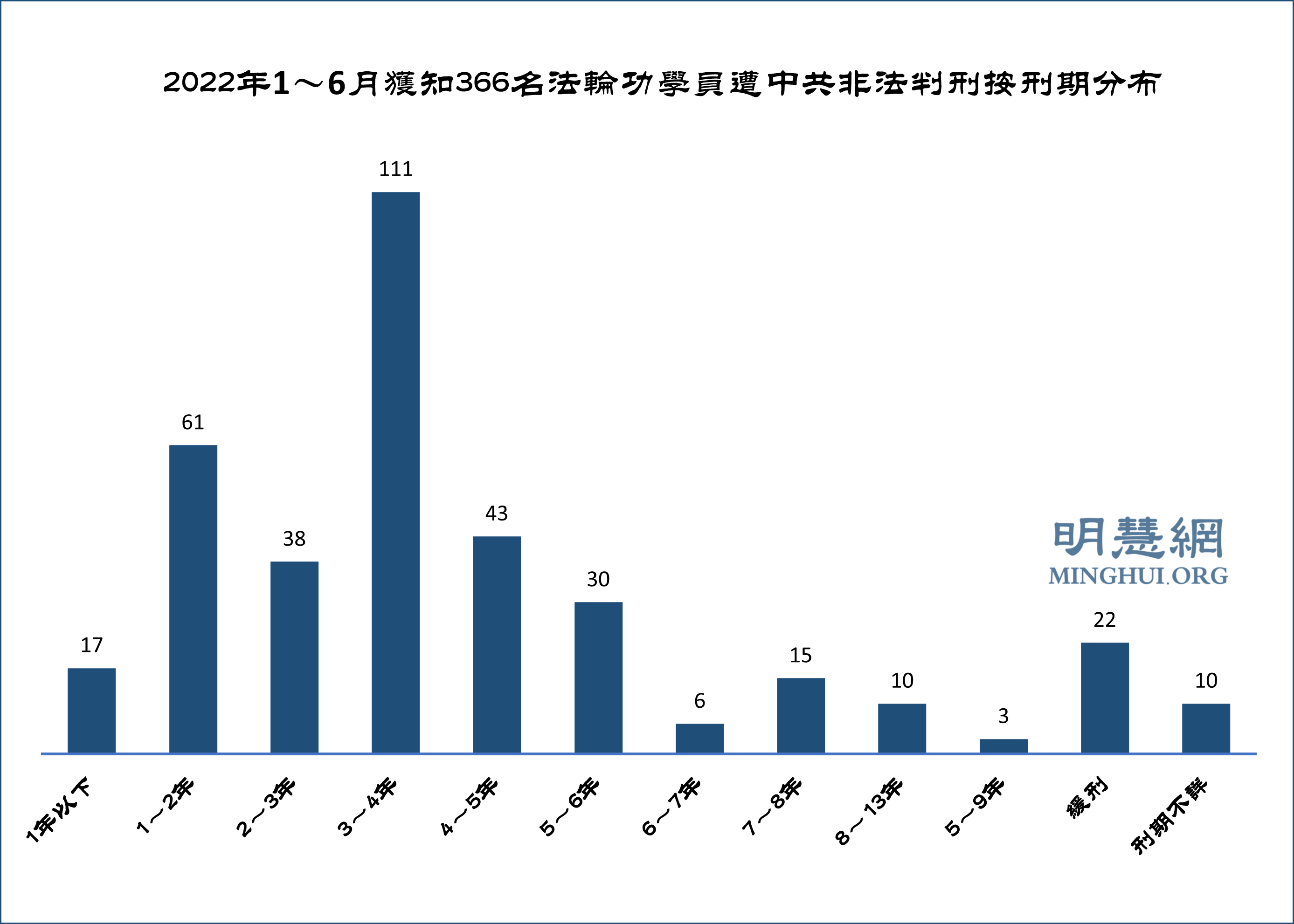 ![]() 图2:2022年1~6月获知366名法轮功学员遭中共非法判刑按刑期分布 |