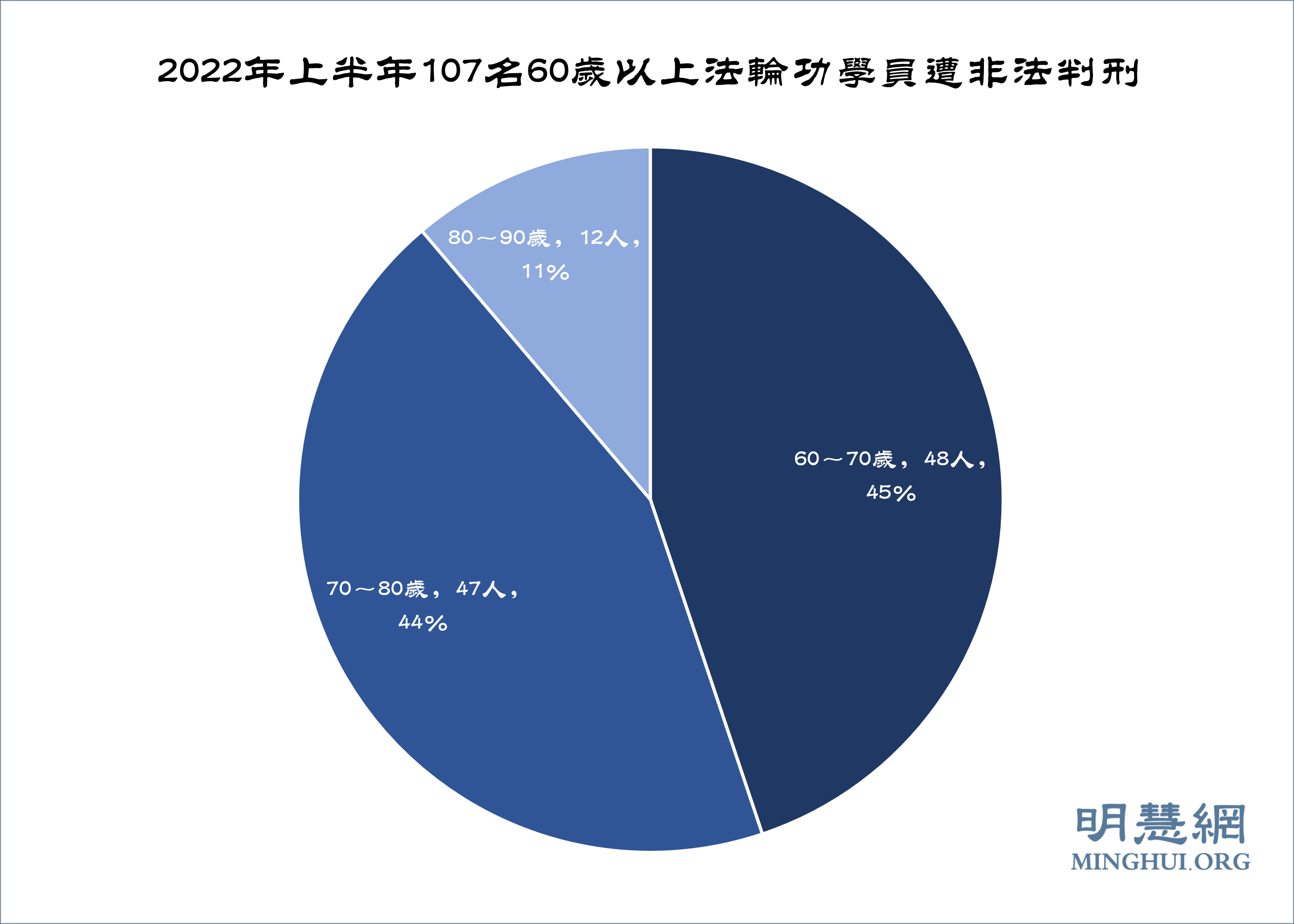 据明慧网报道统计,二零二二年上半年,有107名60岁以上老年法轮功学员被非法判刑,年龄最长者85岁。其中,80~90岁的12人,70~80岁的47人,60~70岁的48人。