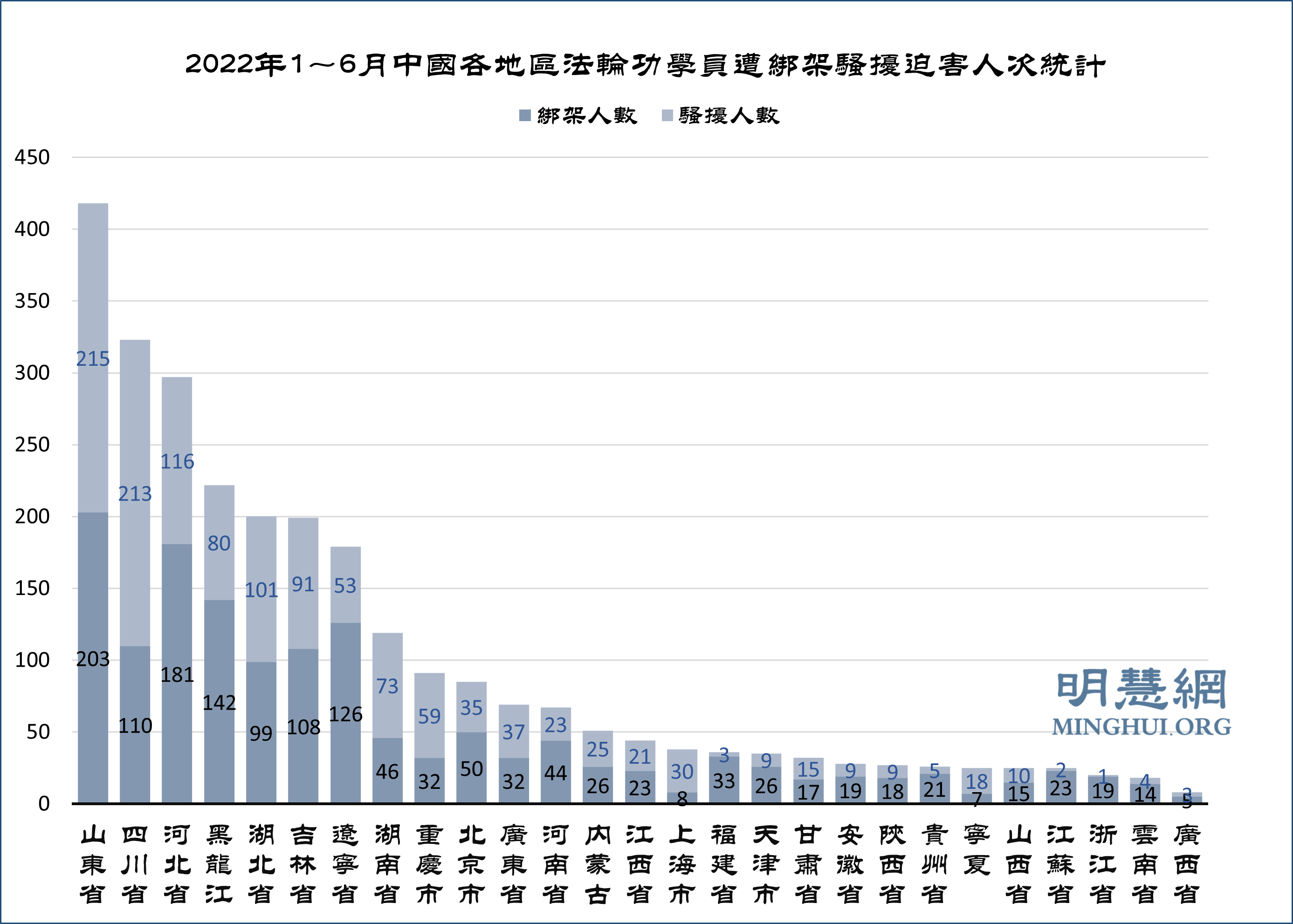 ![]() 图1:2022年1~6月中国法轮功学员遭中共迫害人次统计 |