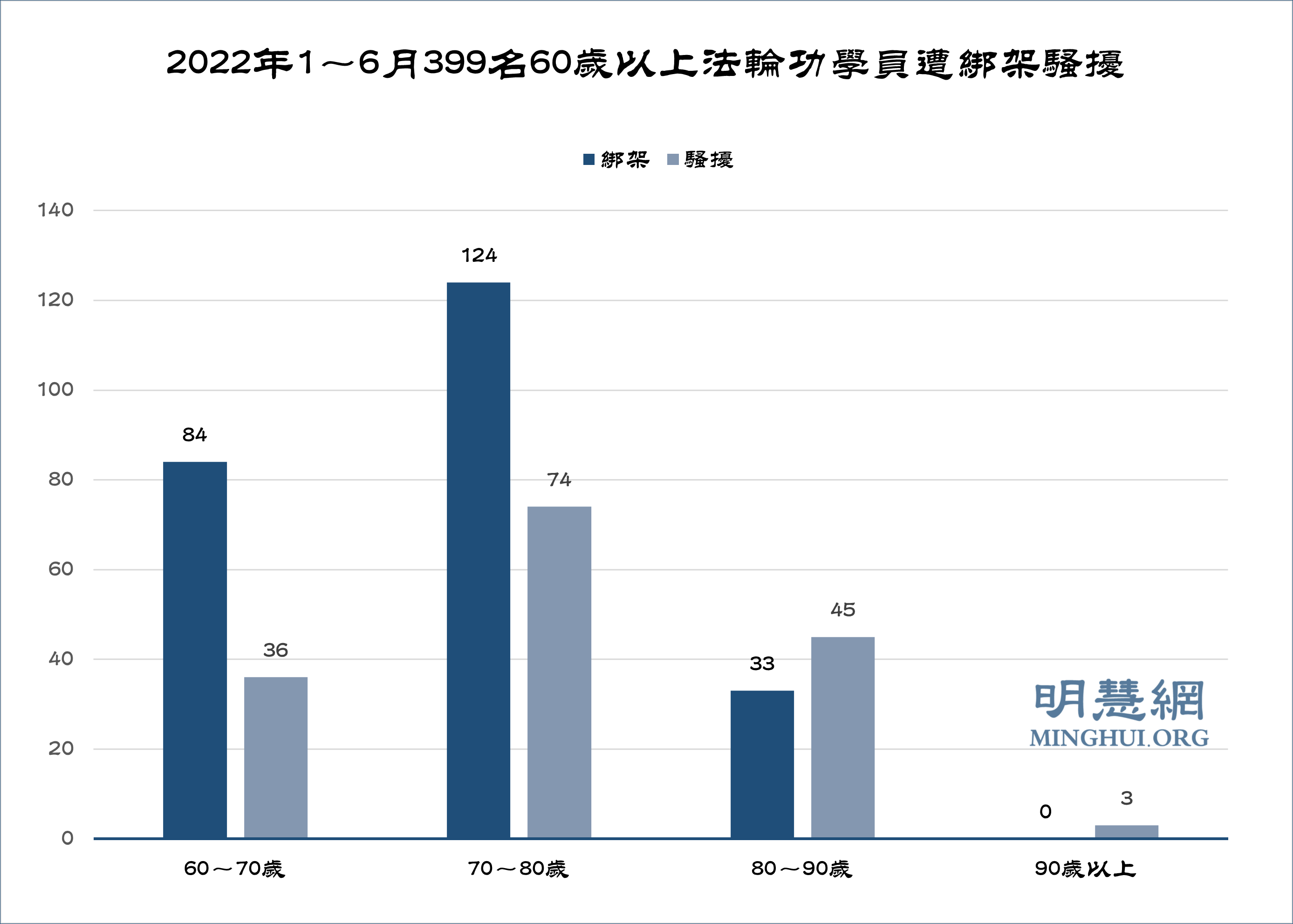据明慧网报道统计,二零二二年上半年60岁以上法轮功学员遭绑架、骚扰399 人。其中,绑架241人,骚扰158人。年龄最长者92岁,90岁以上3人,80~90岁78人,70~80岁198人,60~70岁120人。