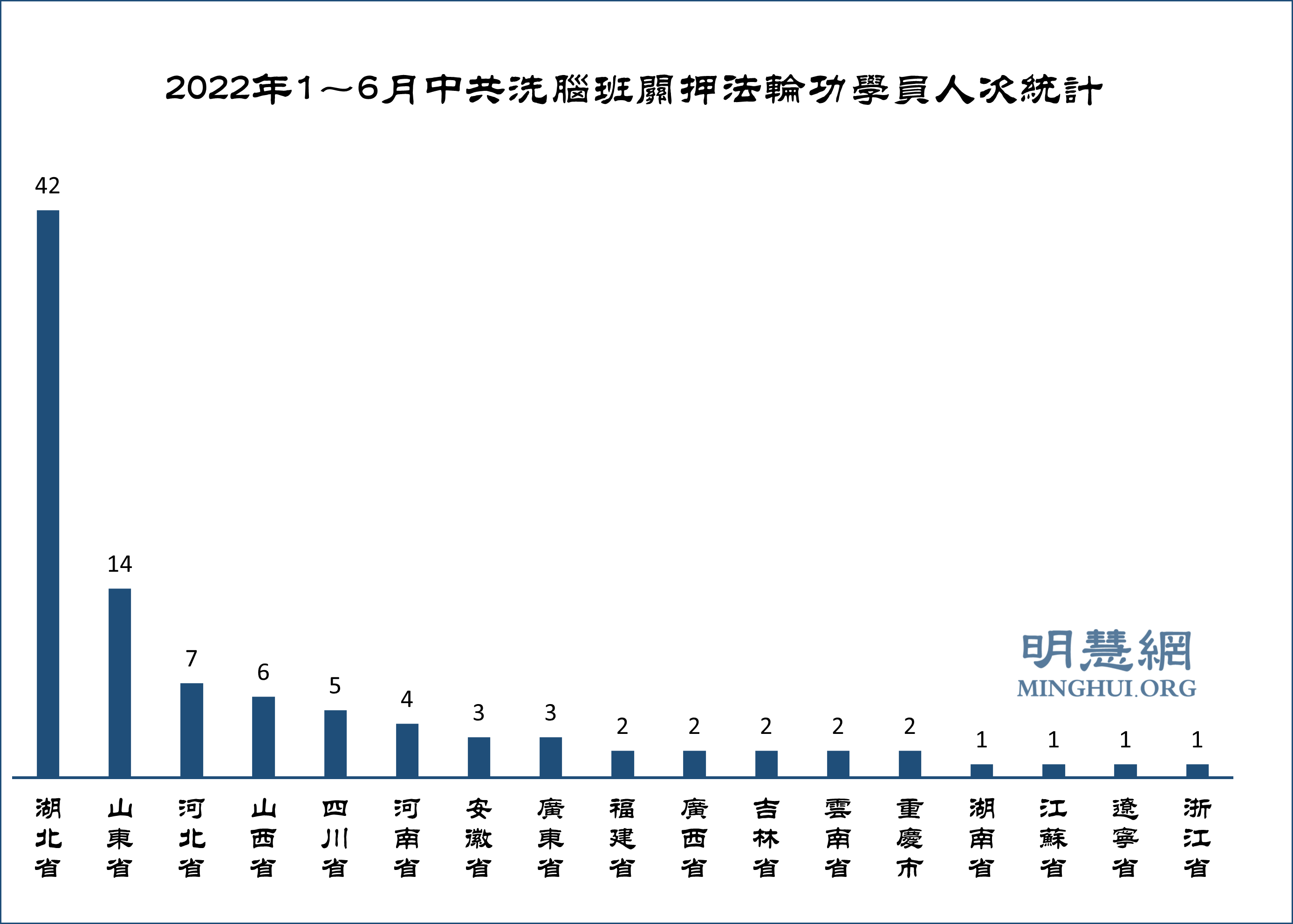 据明慧网报道统计,获知二零二二年上半年中国大陆法轮功学员被非法强制送入洗脑班98人。迫害最严重地区:湖北省42人,山东省14人,河北省7人,山西省6人,四川省5人。
