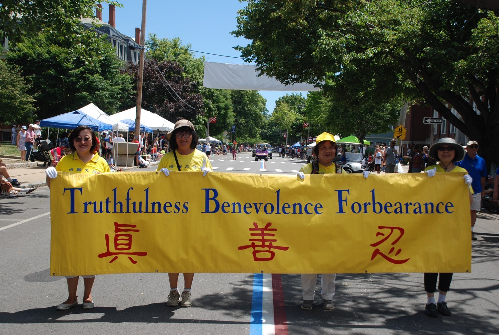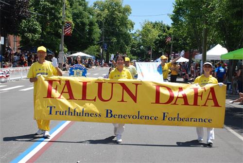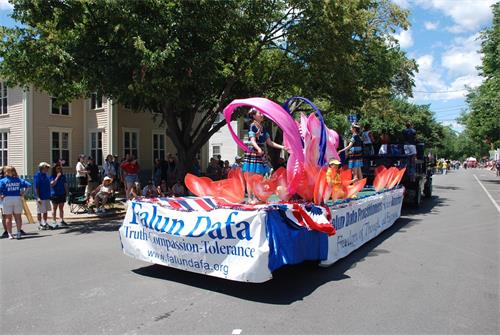 与往年一样,法轮功学员的游行队伍受到两旁观众的欢迎。在法轮功学员的队伍由“法轮大法 真善忍”等横幅队伍,还有精美的花车;伴随着悠扬的乐曲,两位法轮功学员演示法轮功的第五套功法——神通加持法。