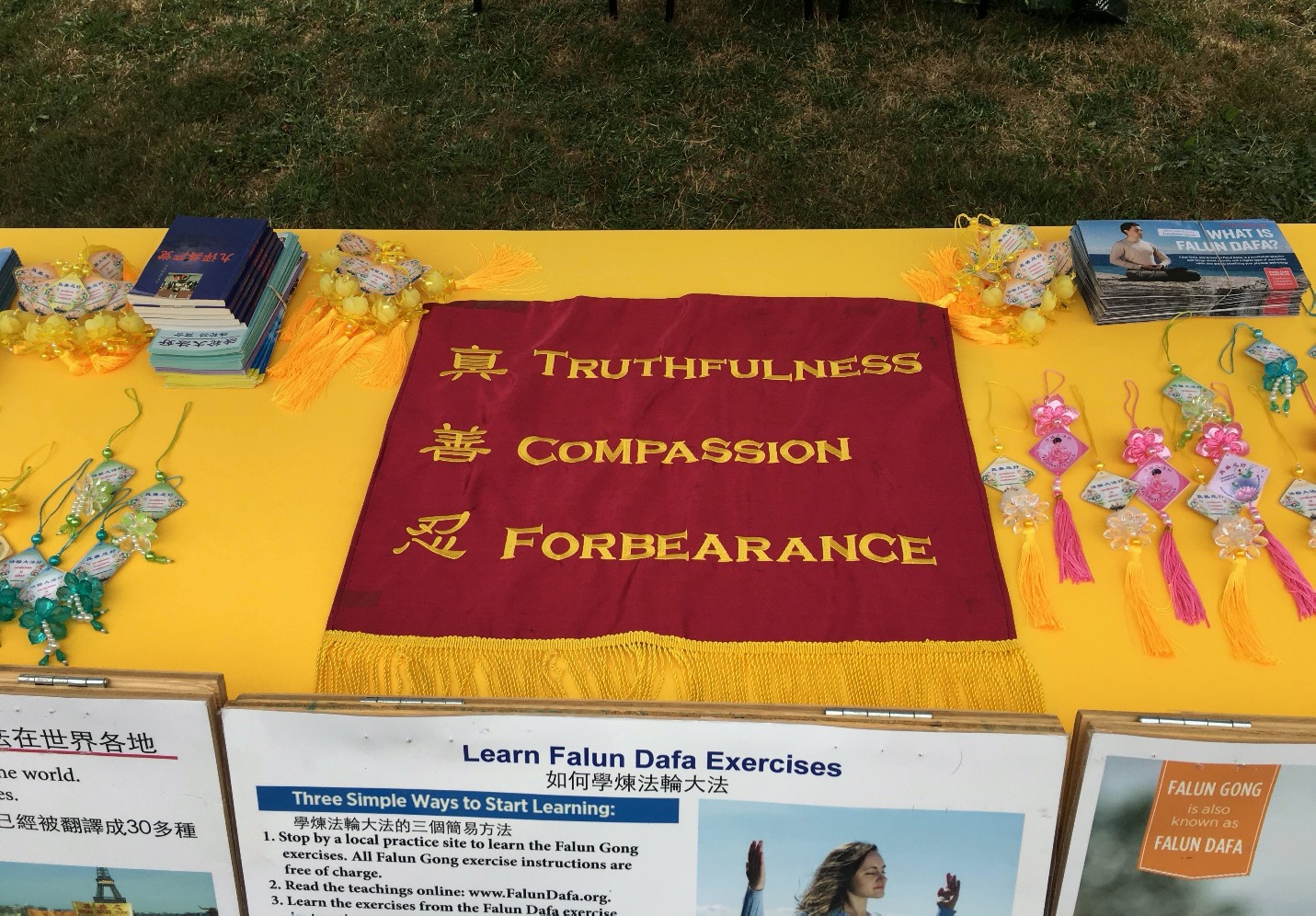 学员们在展位上摆放了美丽的莲花和两幅明黄色的横幅,上面用中英文写着“法轮大法好”和“真善忍好”。许多人被美丽多彩的莲花所吸引,对学习这种和平的打坐修炼很感兴趣。