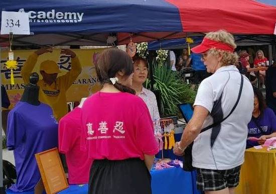 在活动现场,学员们向参加活动的当地民众介绍法轮功,讲述法轮功被中共邪*党-迫害的真相、征签、现场叠纸莲花、售卖艺术家品牌T恤(Artist Fashion)等。不少美国人还用中文讲出九字真言“法轮大法好,真善忍好”。有民众现场购买了《转法轮》书回家阅读。