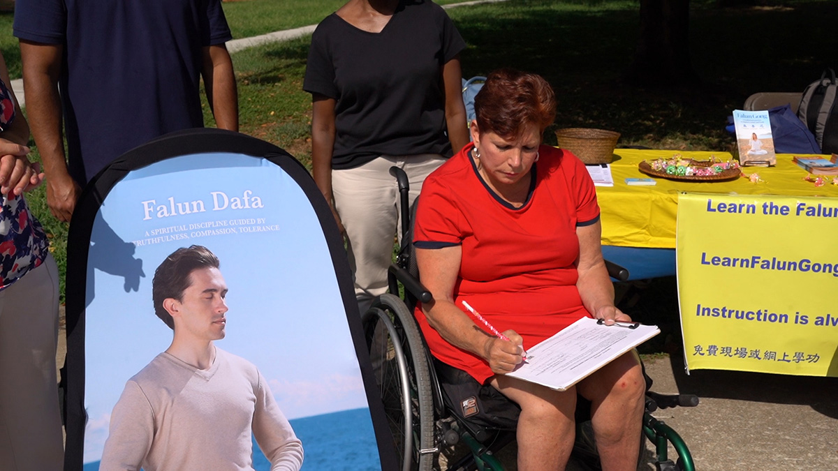 参议员塔塔格利昂来到法轮功展位签字支持,她说:“我将做任何你们需要我做的事情。作为州参议员我有责任这样做。在这里我百分之百地签字支持。”她也是2021年宾州参议院反对中共活摘法轮功学员器官的98号决议案的联署人之一。