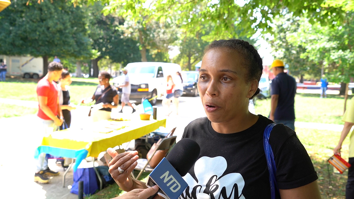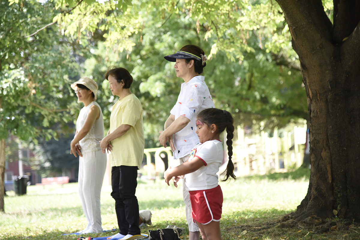 在费城警察局工作的阿提亚·摩尔(Atiya Moore)带着六岁和两岁的两个小孩,一起学炼了法轮功。学功后,阿提亚开心地说:“炼功后我感到很平静。我感到更加放松,恢复了活力。我真的觉得自己更有能力了,我今天可以把事情做好。因为在我来之前,我感到有点沮丧。”她说她一直想学(打坐),现在学会了一点,她回去后要继续学,并想参加周末在费城自由钟广场的集体炼功。