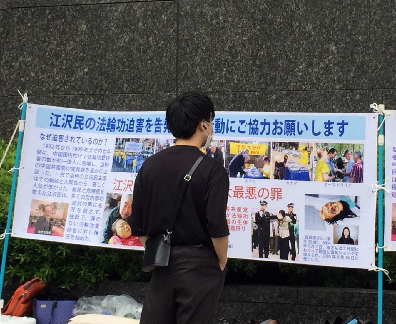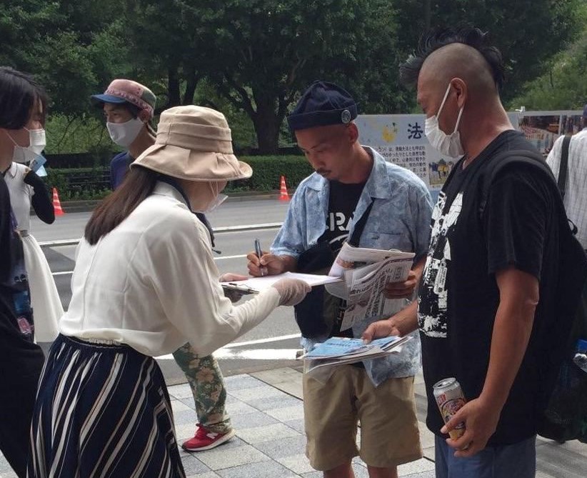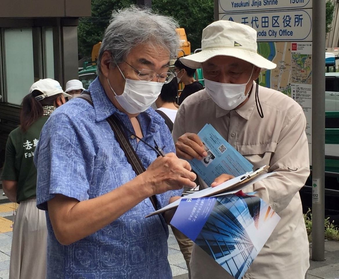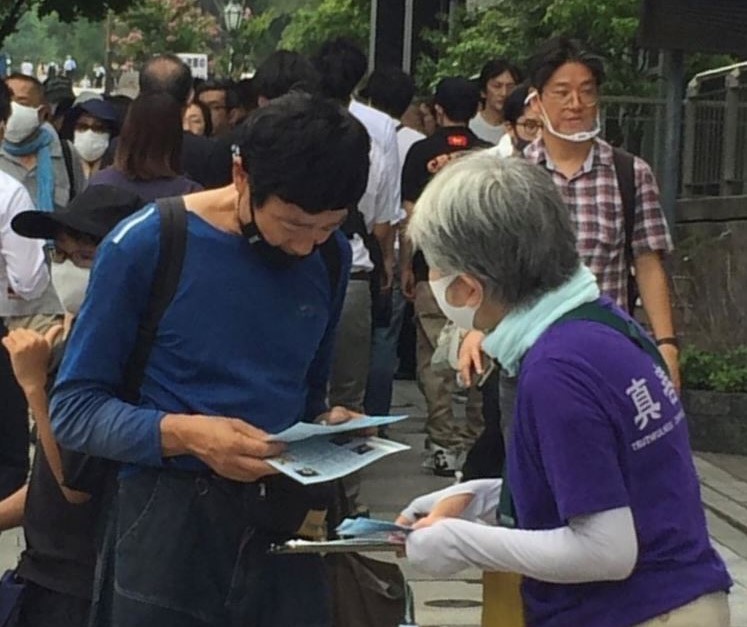 从九段下车站的入口处,就会看到学员们的醒目横幅:中共病毒给世界带来灾难。一位年轻人放下公文包,认真又庄重地签下了自己的姓名,心满意足的离去。还有一位听耳机的年轻人,居然摘下耳机,把学员拉到一旁,希望能给他详详细细地讲清真相。