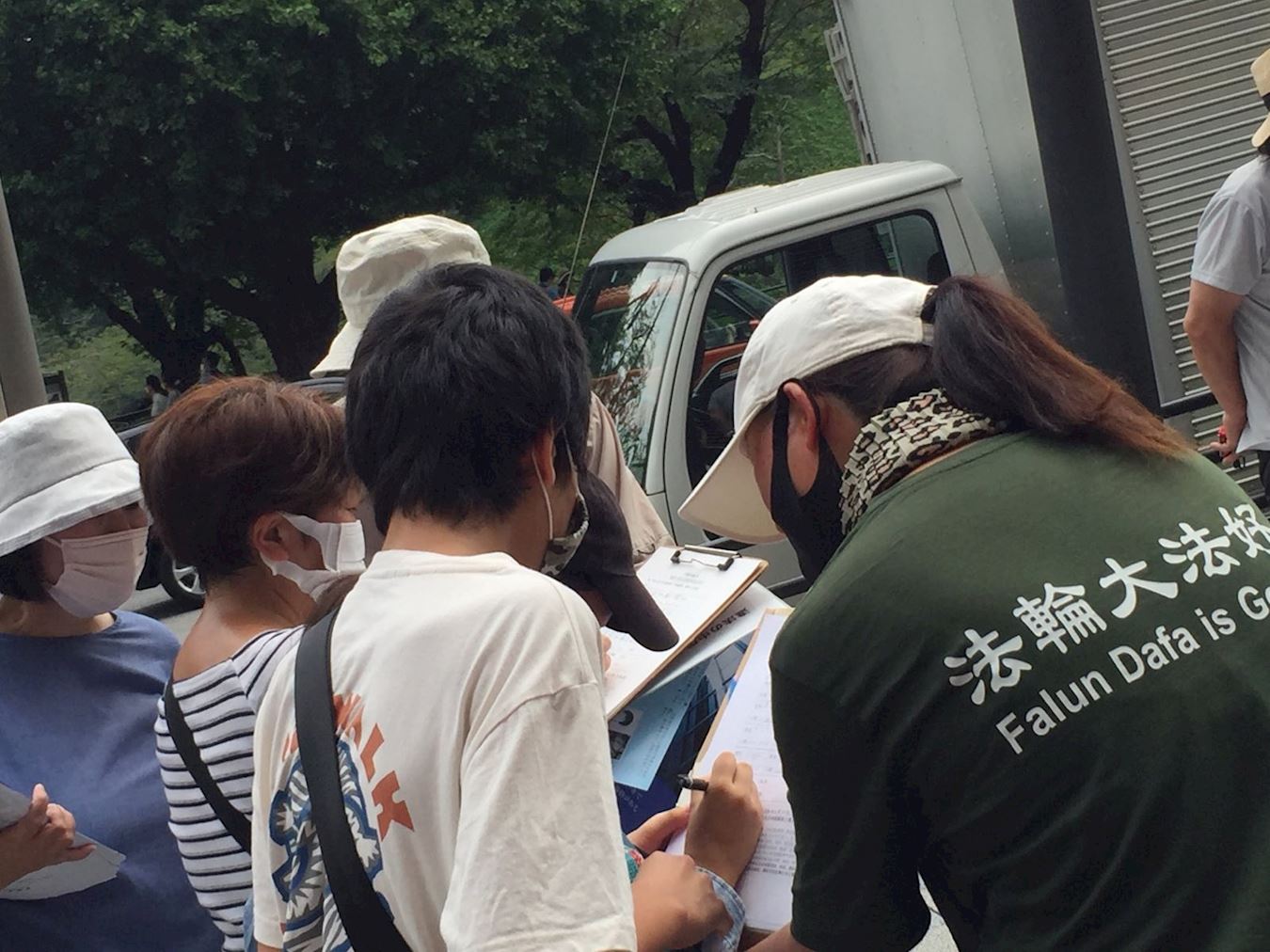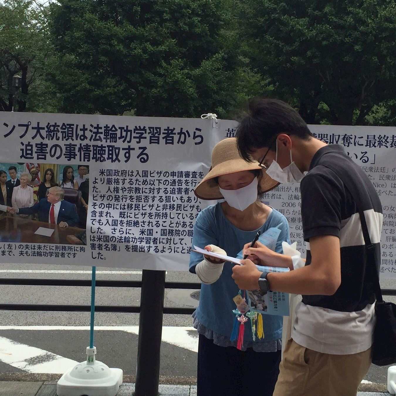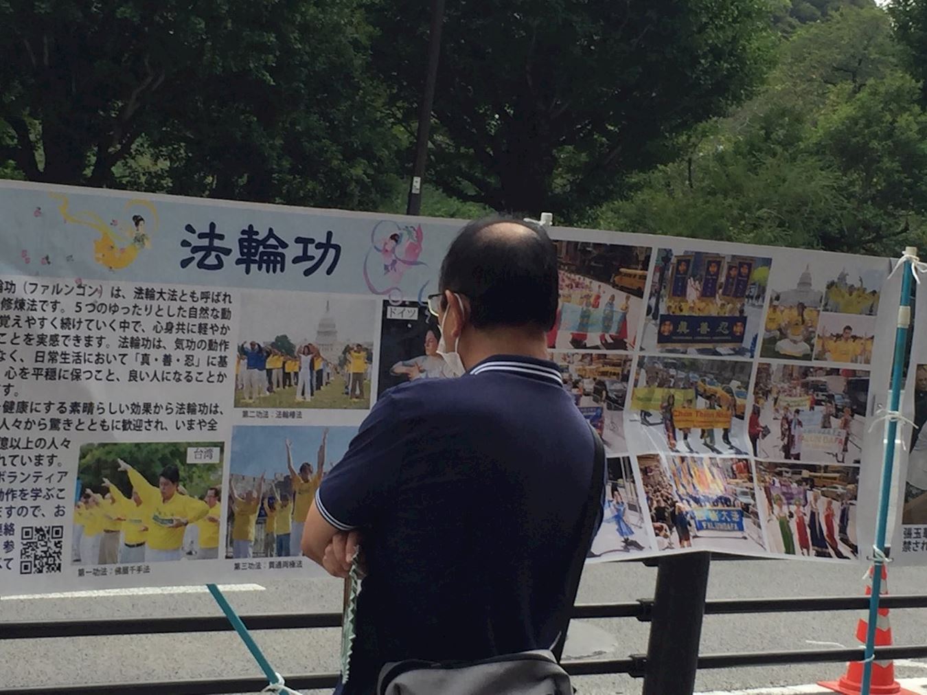 从九段下车站的入口处,就会看到学员们的醒目横幅:中共病毒给世界带来灾难。一位年轻人放下公文包,认真又庄重地签下了自己的姓名,心满意足的离去。还有一位听耳机的年轻人,居然摘下耳机,把学员拉到一旁,希望能给他详详细细地讲清真相。