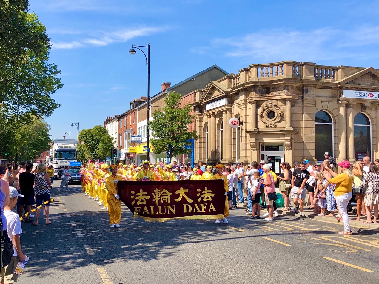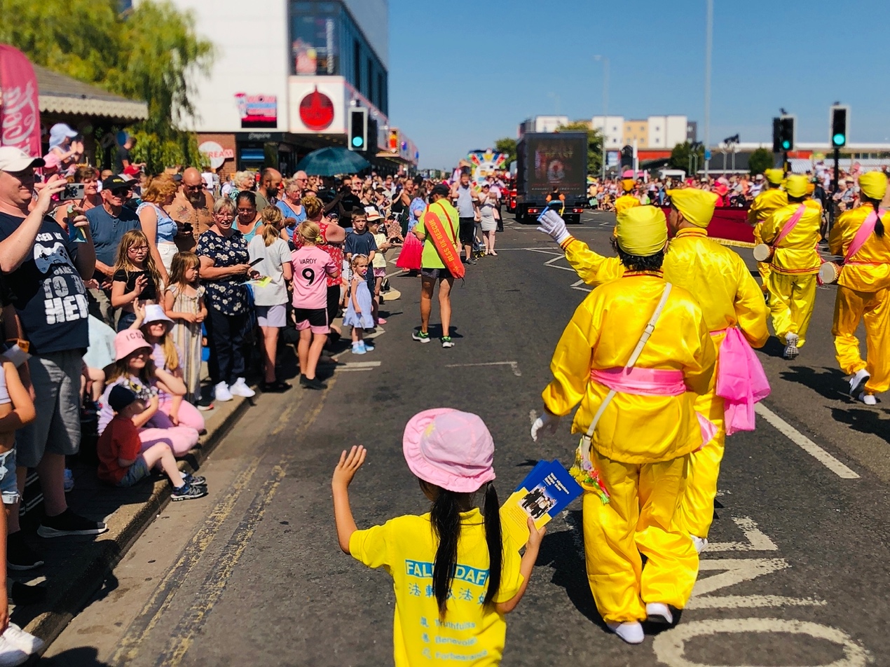 本次游行是腰鼓队夏季演出的第三场,也是三次游行以来观众人数最多的一场。英国法轮功学员组成的腰鼓队于当天下午一点左右开始游行,前排由两名学员展开“法轮大法”横幅,中间是腰鼓演员作为表演主体,最后以中鼓演员为腰鼓队压阵。游行表演了《法轮大法好》等曲目。