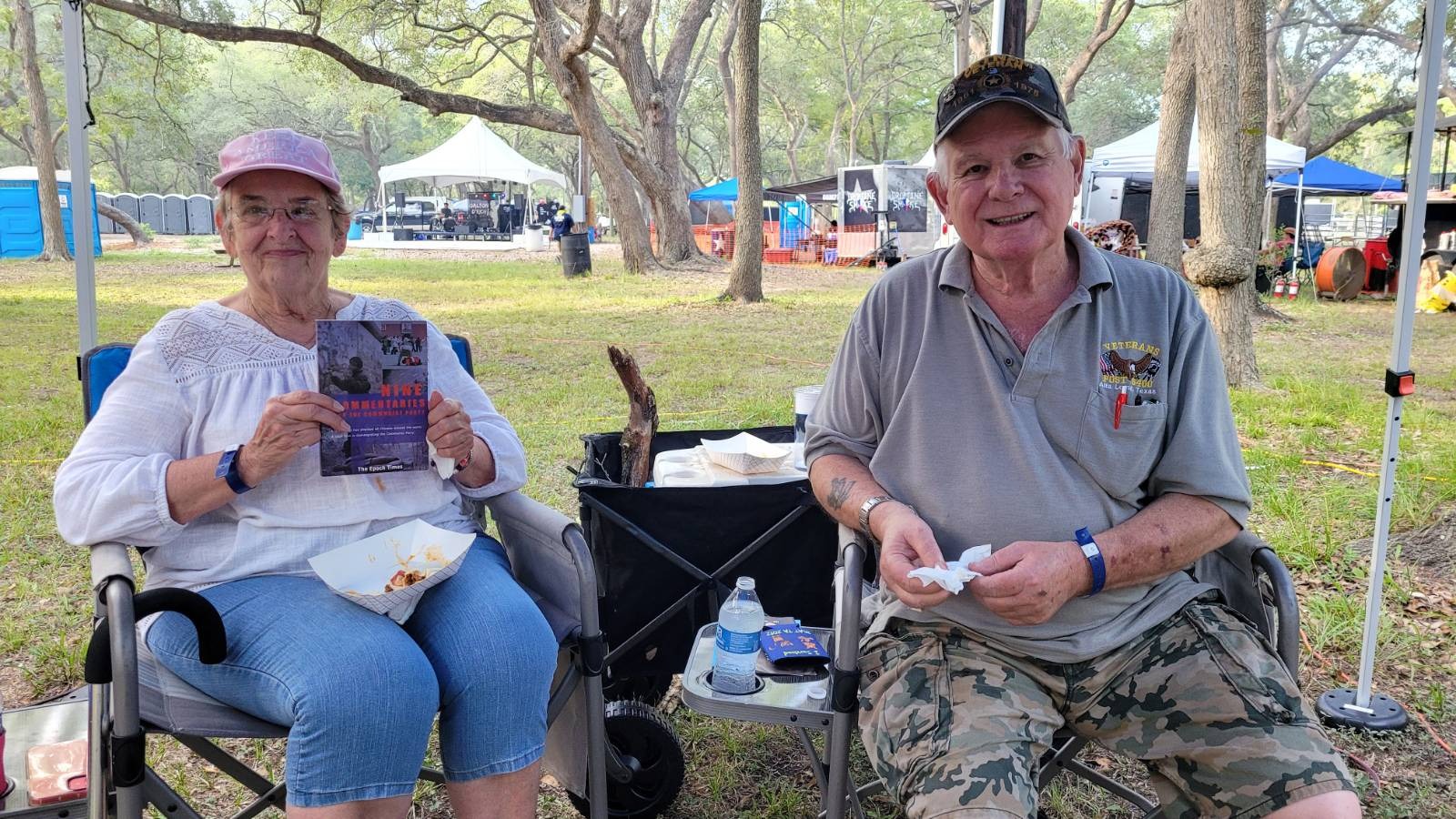 另一个摊位上的一对夫妻,妻子叫唐娜(Donna),先生叫罗伯特(Robert),学员向他们介绍法轮功及修炼法轮功的美好,包括中国的法轮功修炼者正在遭受着中共的迫害,夫妇两人欣然签名支持法轮功学员反迫害。老先生认同共产主义渗透美国无孔不入,并表示会去上网阅读《魔鬼在统治着我们的世界》和《·九·评*共产党》书籍。他们还欣喜地把学员赠送的手工制作小莲花挂在自己的摊位上。