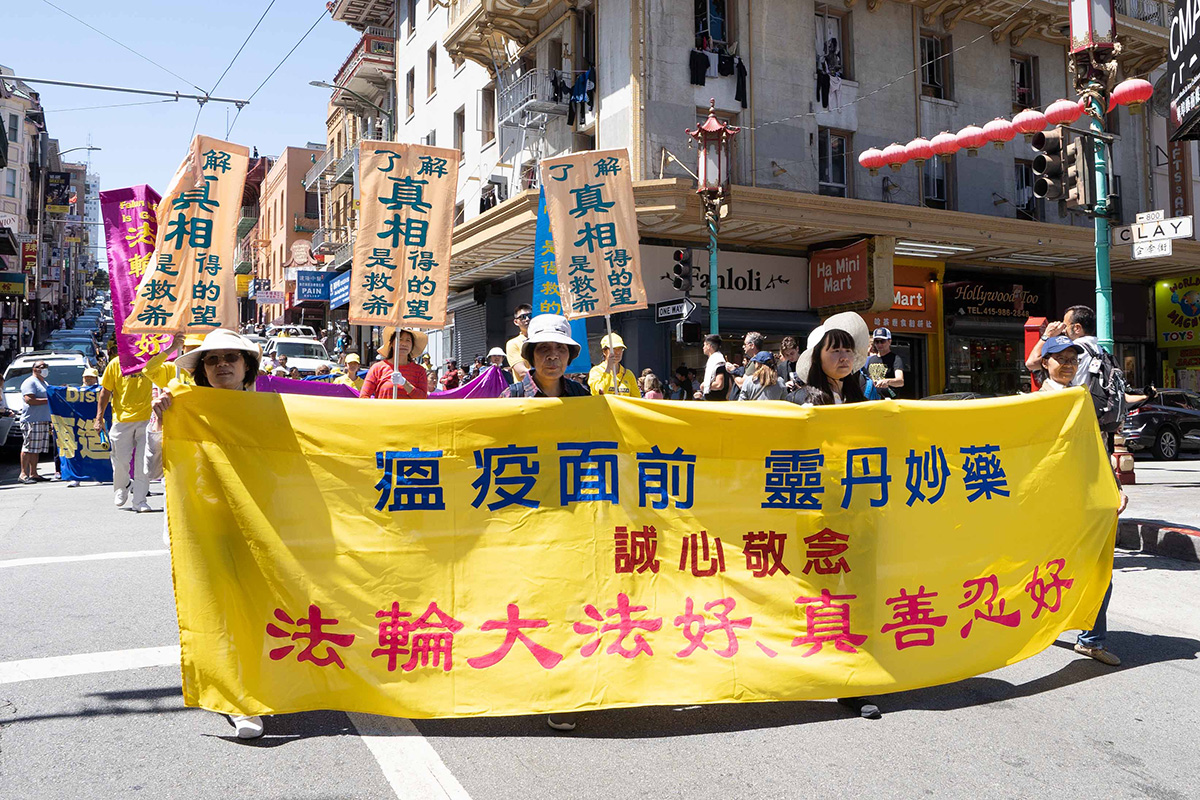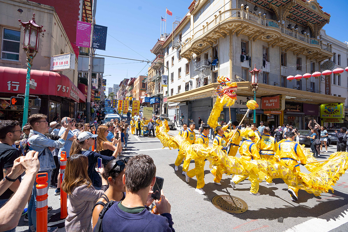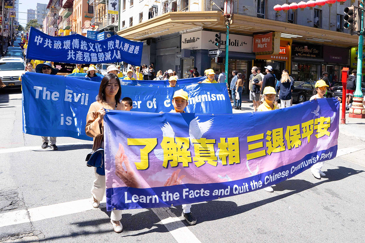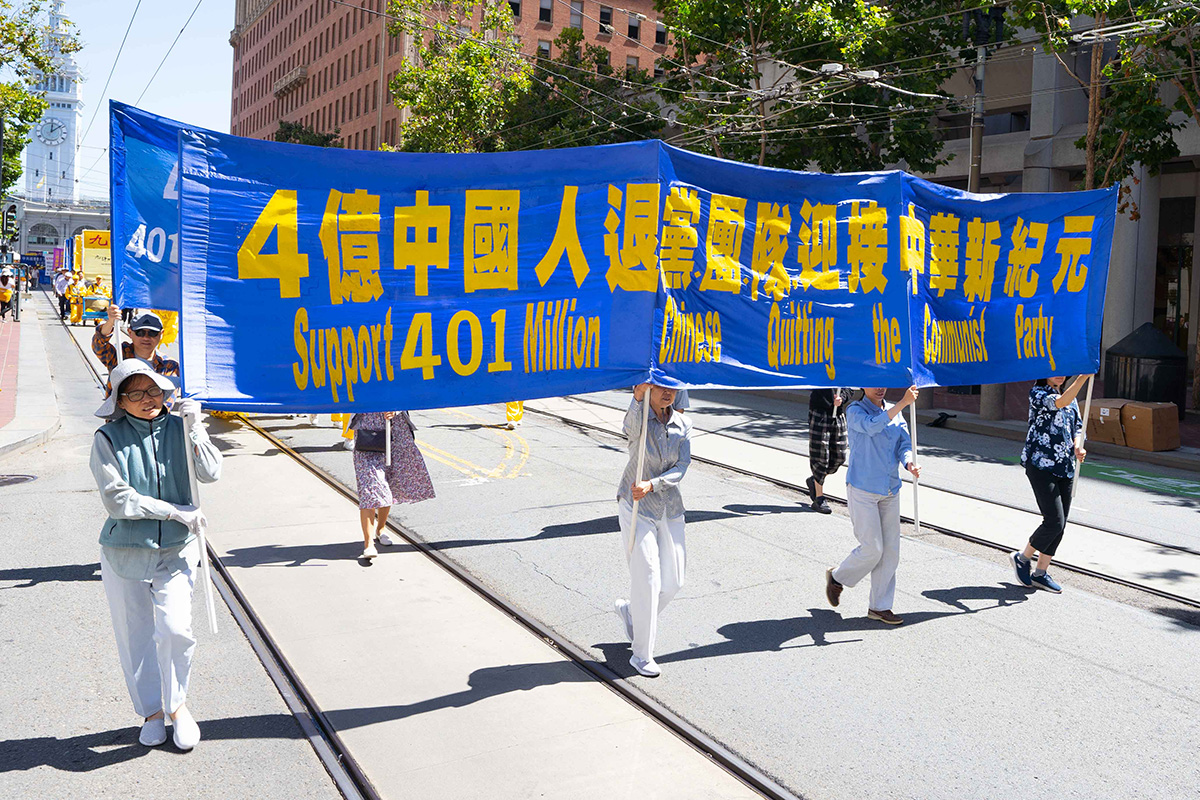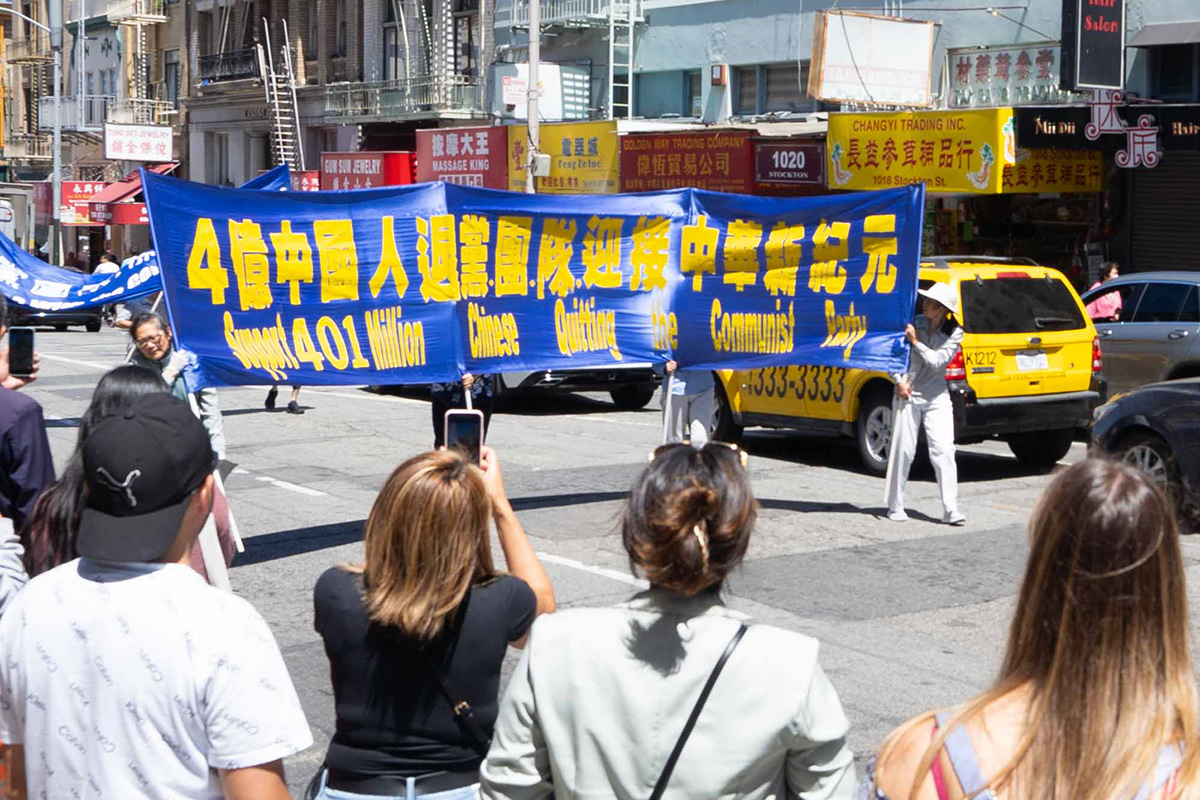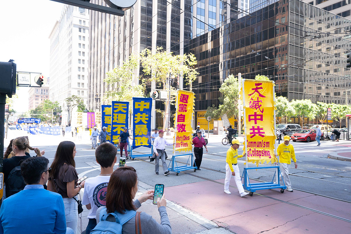 星期六上午十二点,庆祝的游行队伍组成方阵,从旧金山渡轮大厦出发,在旧金山主要街道游行,然后进入唐人街,最后抵达唐人街花园角广场。参加游行的民众呼吁中国同胞,认清中共本质,早日退出中共,获得美好未来。
