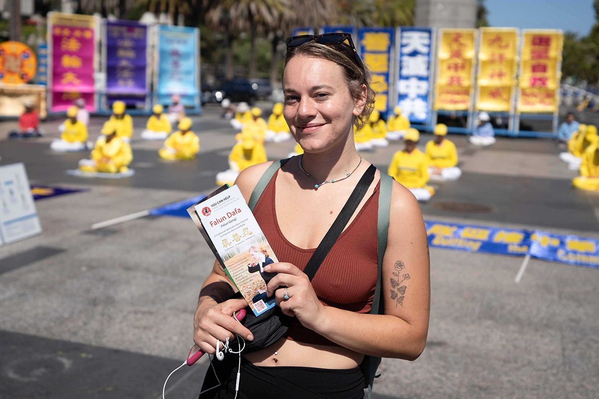 另一位莎拉女士(Sarah)经过法轮功学员的活动现场时,被法轮功学员祥和的炼功场面所吸引,她说,“看到他们在这里祥和的炼功,我感到宁静,我可以感受到他们散发的平和的能量,太美了。”