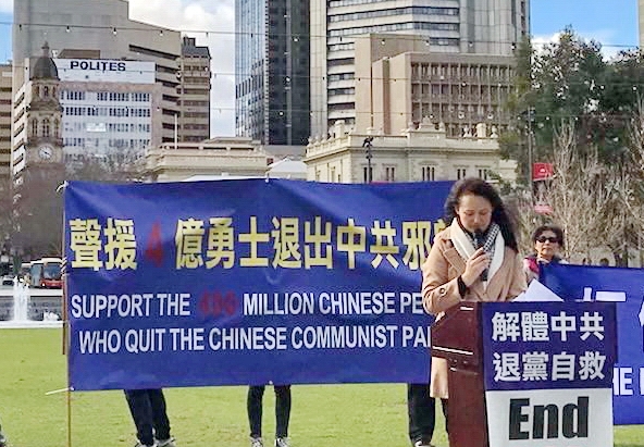 ![]() 图3:二零二二年八月十五日,在阿德莱德举行的庆祝四亿勇士三:退.集会上,活动主办方梅女士在发言。 |