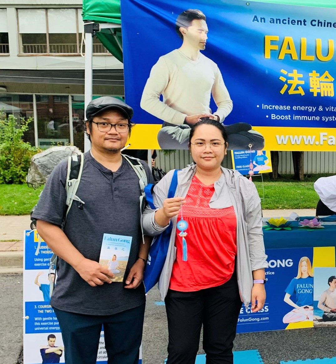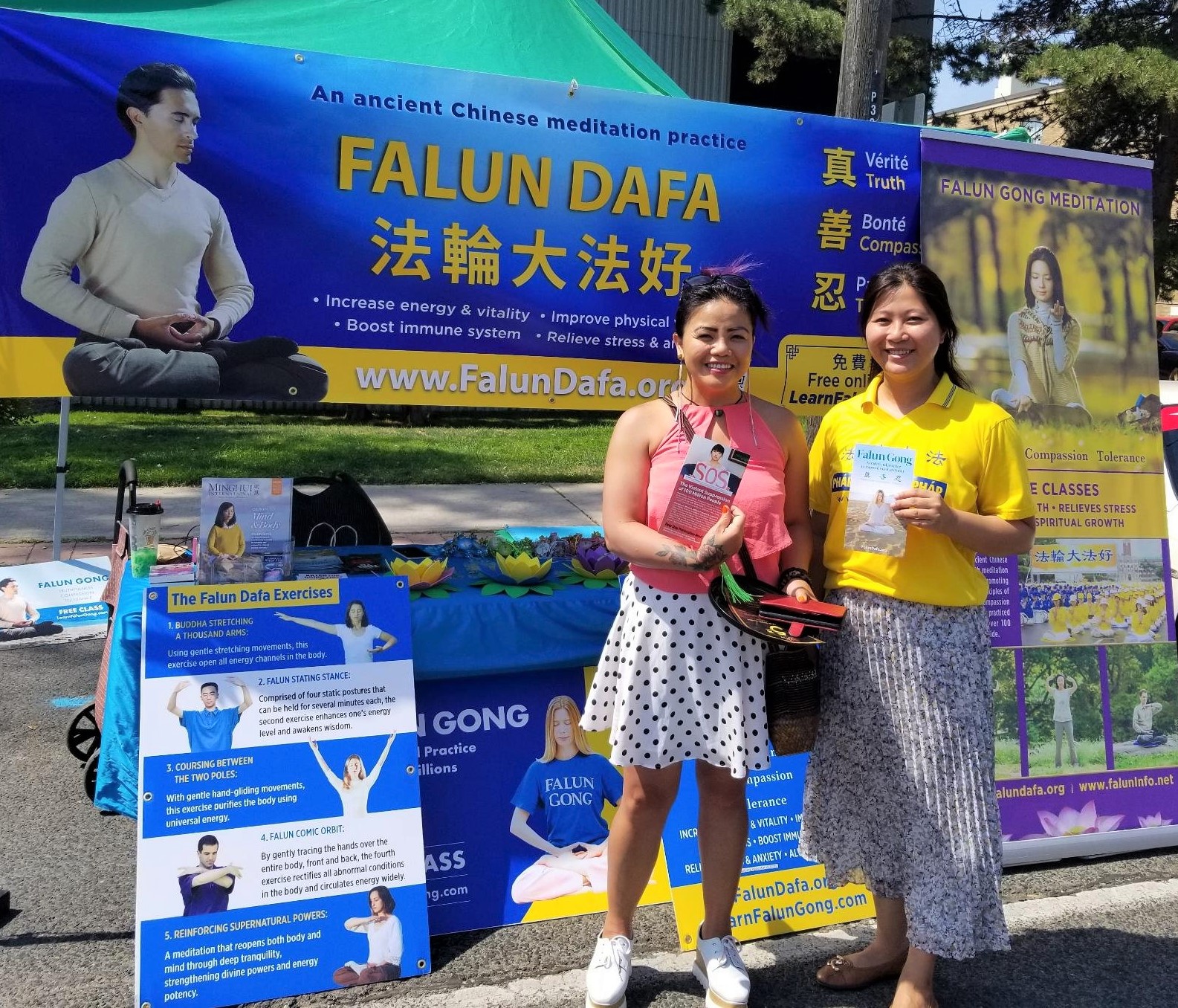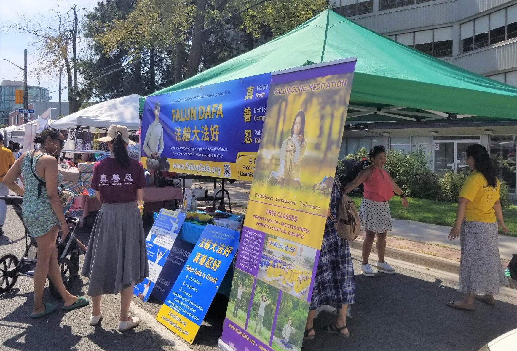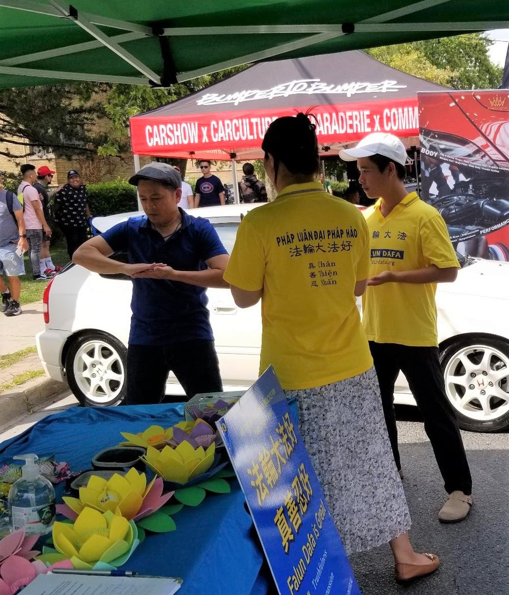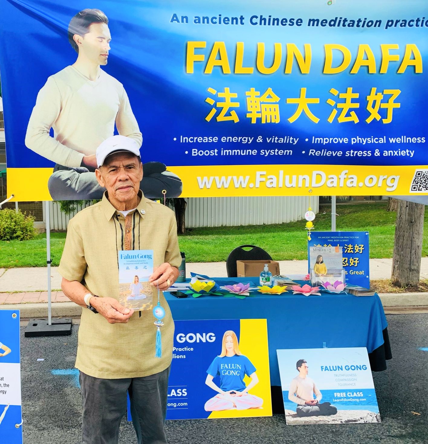 现住在怡陶碧谷(Etobicoke)的马克(Mark)先生,他说他五年前就听说过法轮功受迫害真相,看到有教功法的展位,他先后两次来展位学功。
