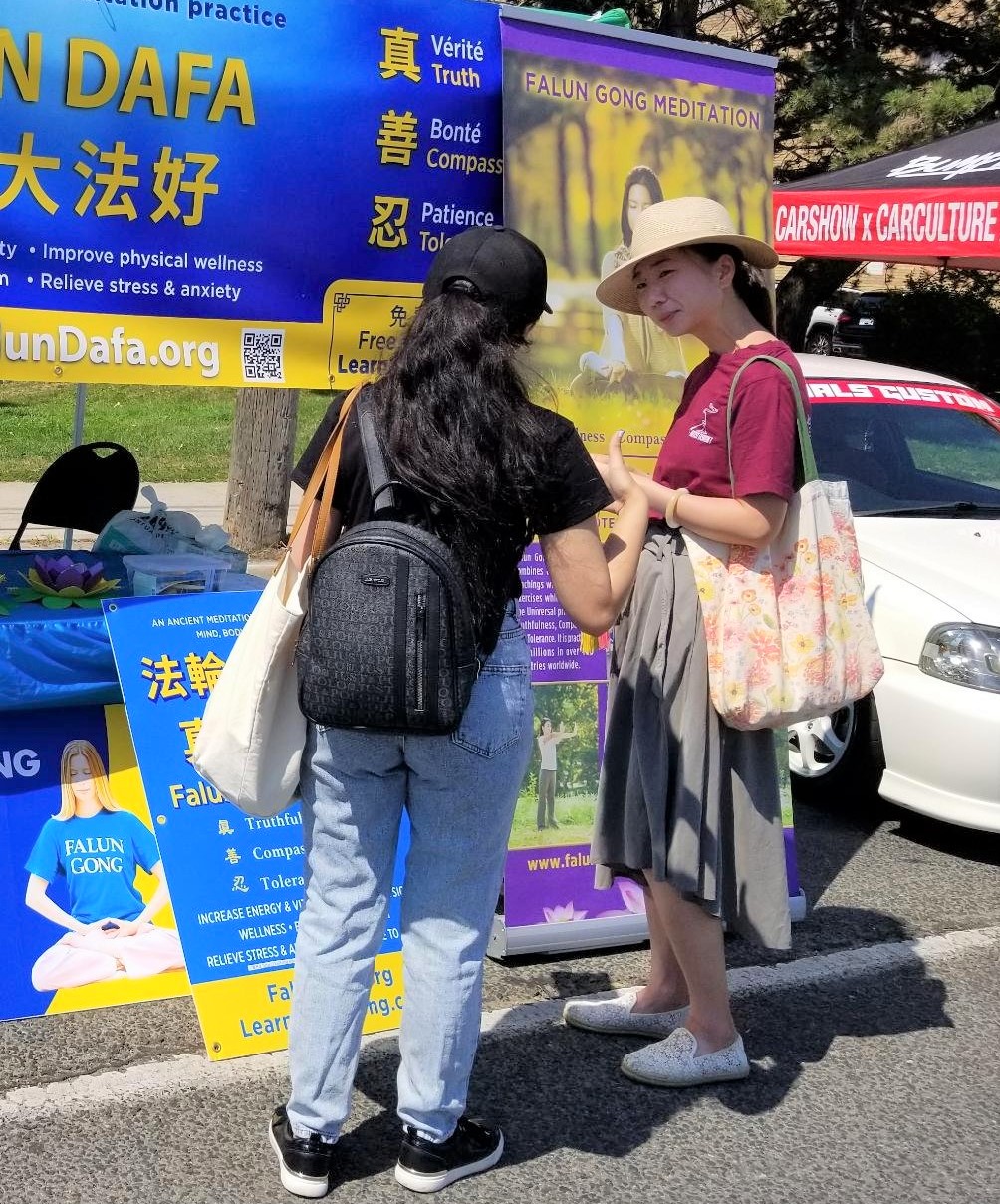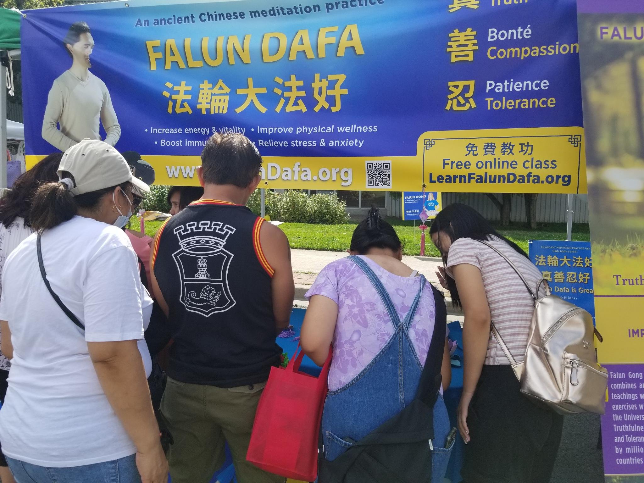 菲律宾女士诺玛(Norma)家住尼加拉瓜瀑布,参加了当天的活动,她说自己在台湾生活过两年,还会讲简单的中文。当她看到大法展位就过来说要学功。学了近半小时,学完后说回家要继续炼。学员告诉她在尼加拉瓜瀑布景点也有法轮功炼功点时,她高兴地说:“我会去参加的。”