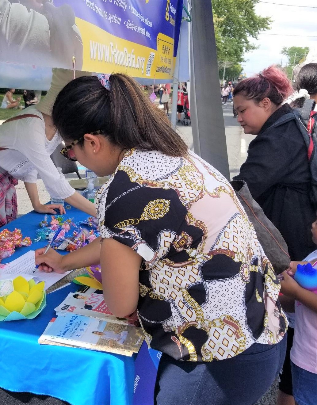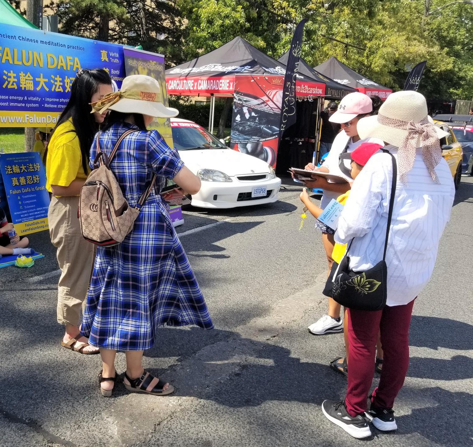 参加活动的很多人签名要求加拿大政府制止迫害和营救在中国受迫害学员和家属,并留下联系方式有的表示愿意参加以后的法轮功对大众的活动。