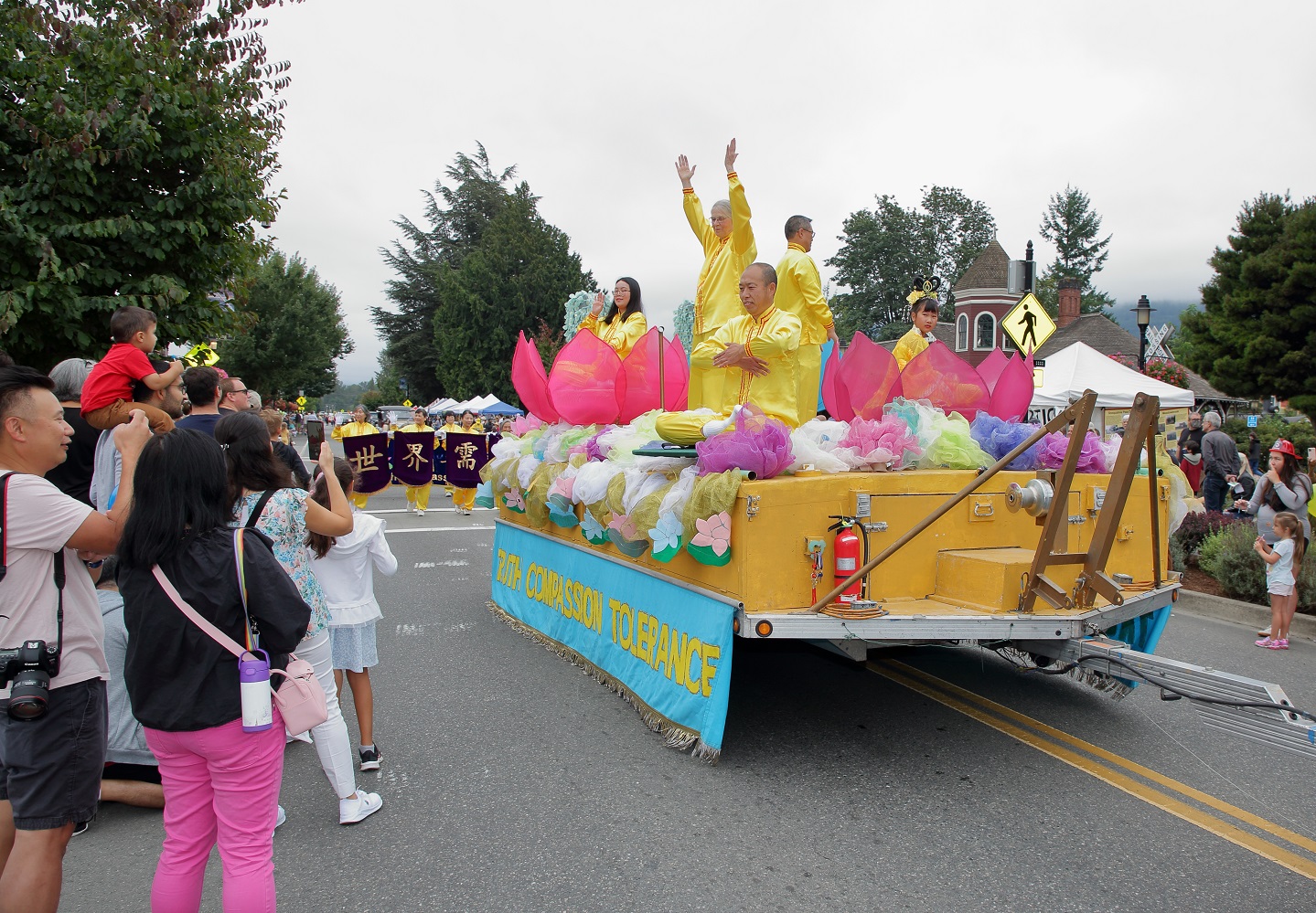 当队伍经过主席台时,主持人介绍说,“法轮功又被称为法轮大法,是一种可以提升身体和精神健康的性命双修功法。法轮功包括动功和静功,并以真、善、忍的原则指导人们提升品行。法轮功从中国传出,现在在100多个国家和地区有上亿人修炼。花车上学员身着传统服装,表演法轮功动功与静功。虽然已经被中共政府迫害23年,中国的法轮功学员仍勇敢地坚持修炼。我们在这里庆祝他们巨大的勇气。法轮大法对每个人都是免费的,如果想要了解更多有关法轮大法的信息,请访问 www.falundafa.org.”