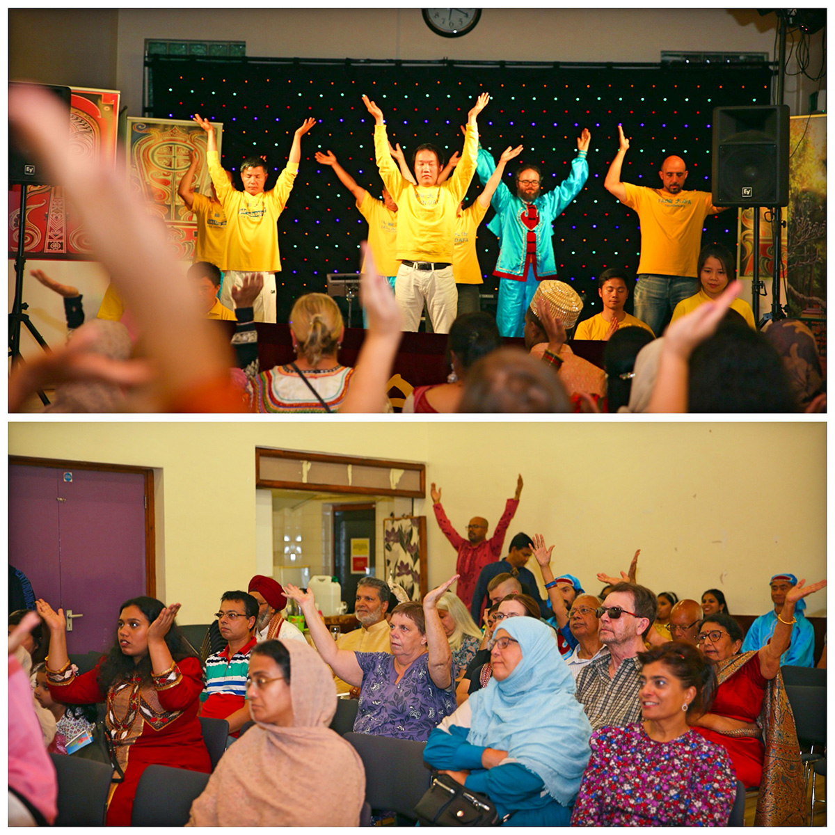 随后学员们登上了议会社区大厅内的舞台上,首先初步介绍了法轮功的基本信息,在炼功讲解音乐的带领下,为现场的来宾展示了法轮功的五套功法。台下的观众有的马上模仿学员的动作学了起来,大厅内的气氛充满祥和。功法展示结束后,大家阅读着手上的法轮功传单,很多人希望参加本地区的法轮功炼功点,并再次感谢学员们的到来和精彩的表演。