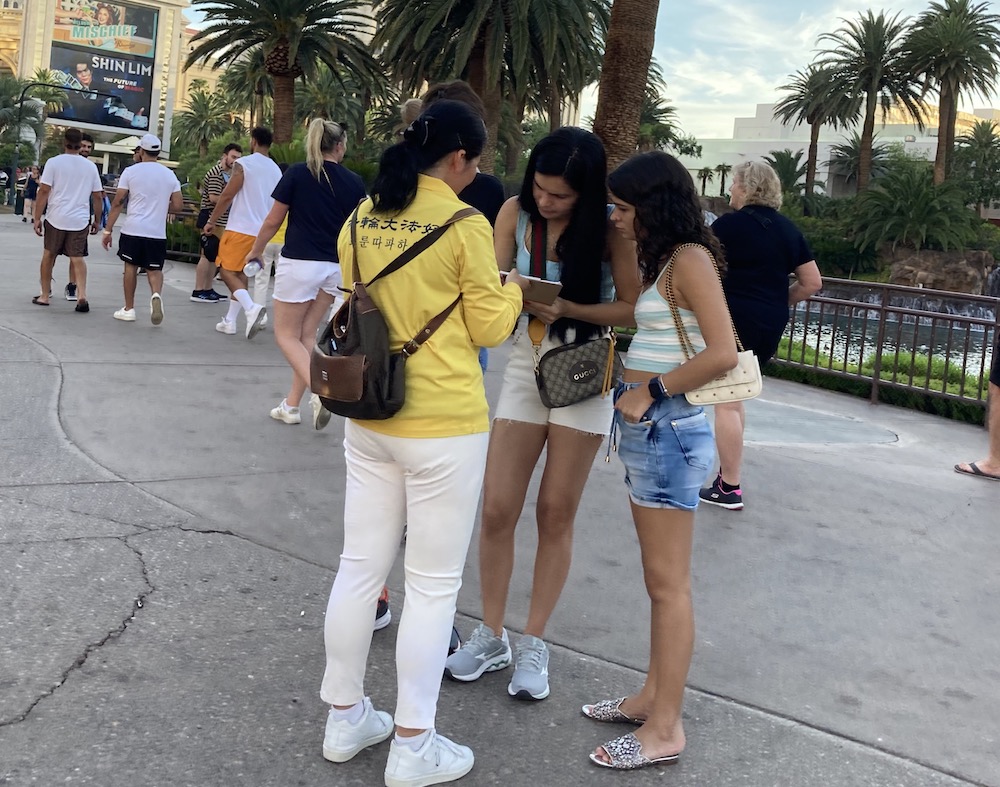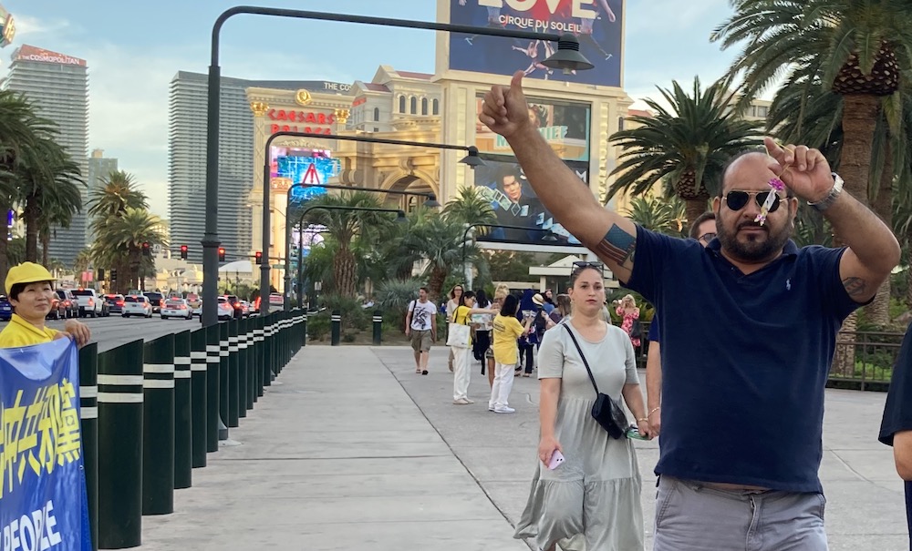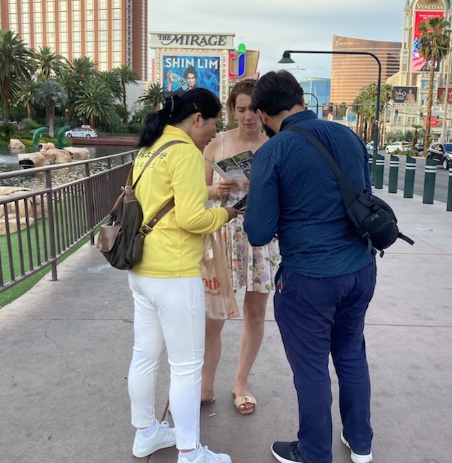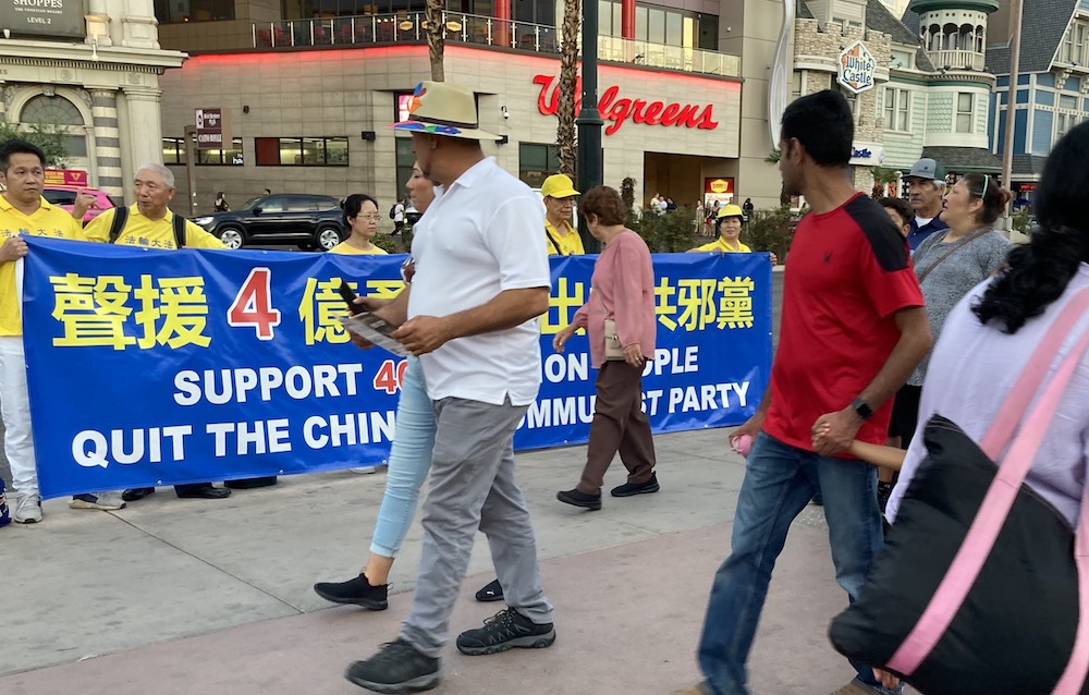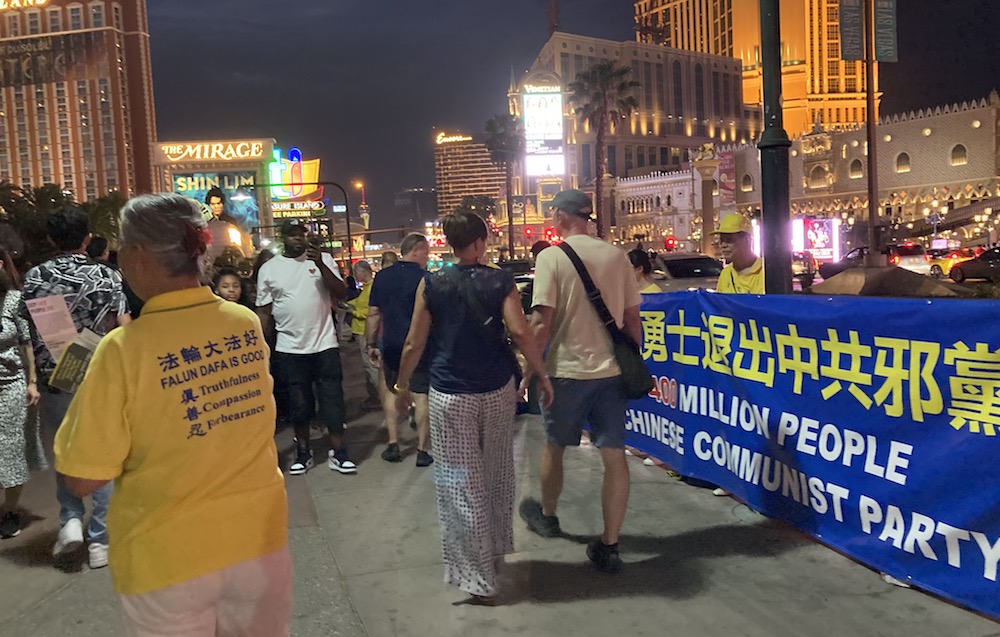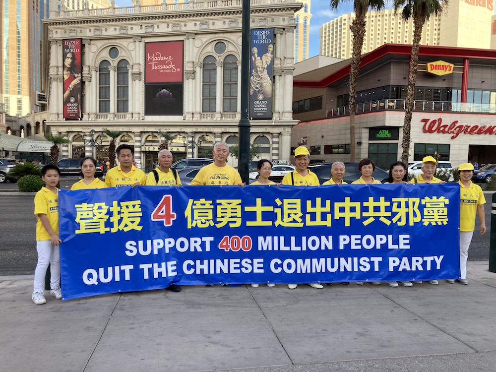 为庆祝这历史时刻,拉斯维加斯法轮功学员在景点,面对人来人往的游客,打开写有中英文横幅“声援四亿勇士退出中共邪*党-”。