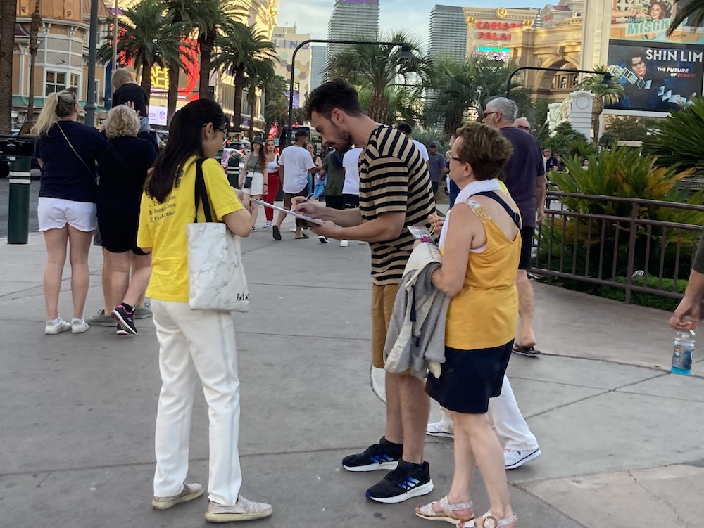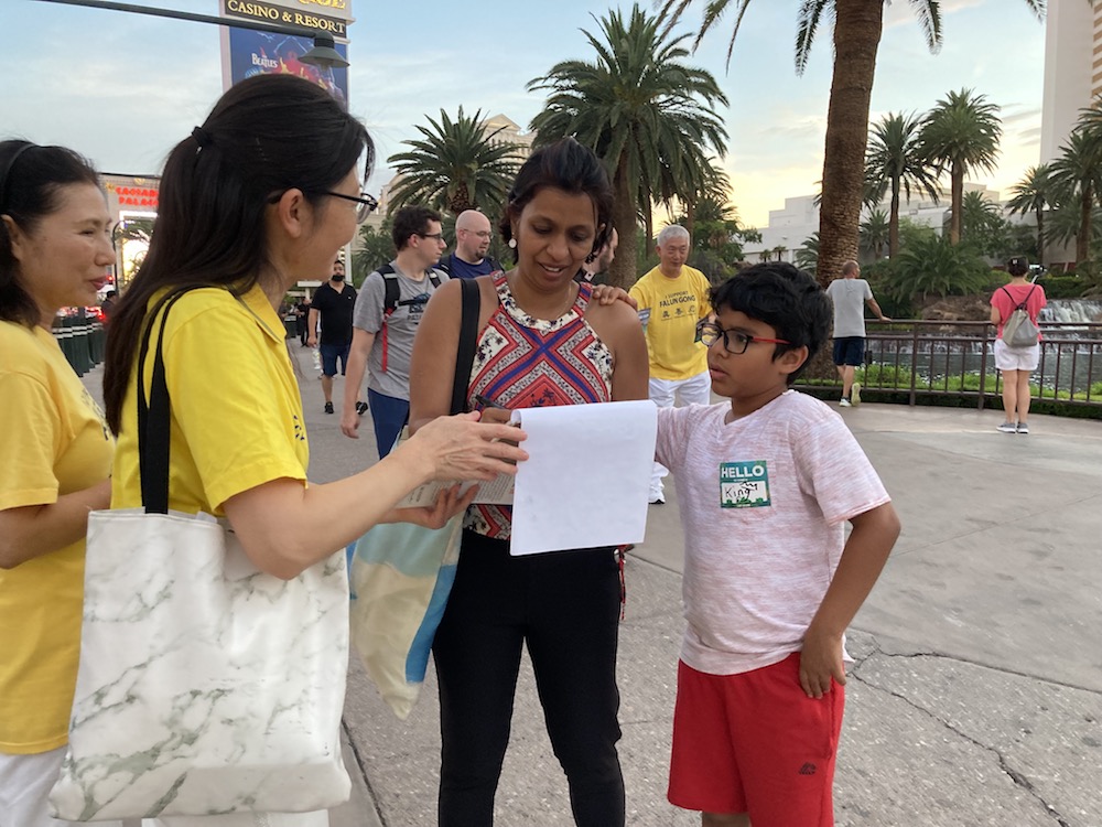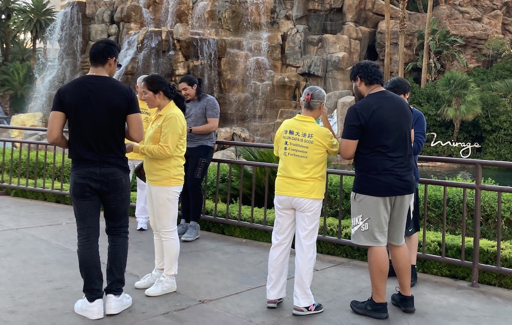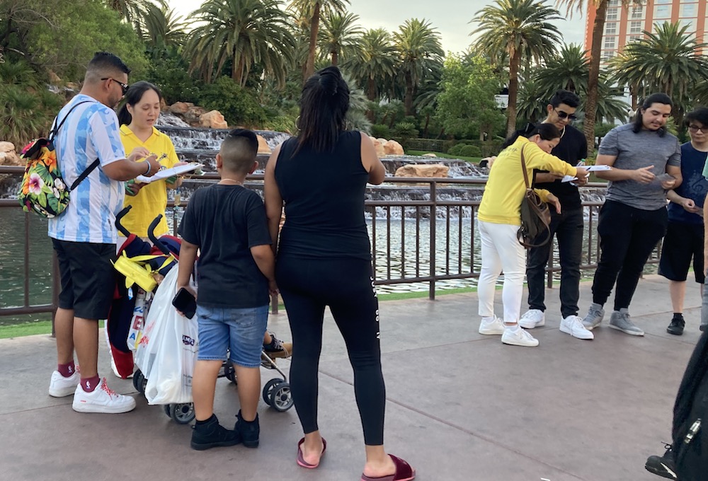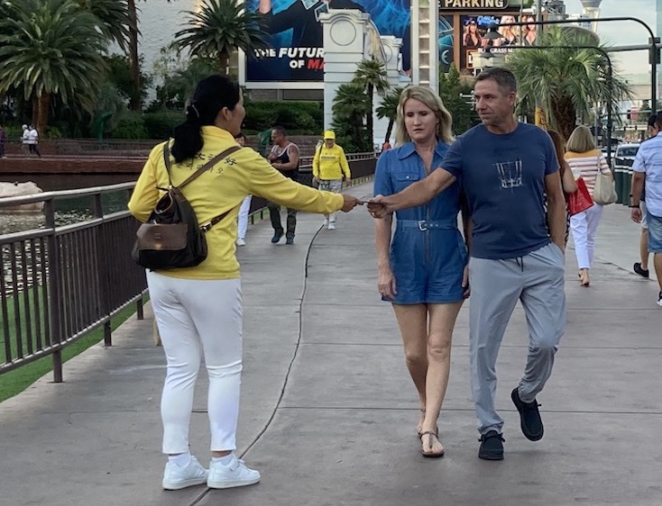 为庆祝这历史时刻,拉斯维加斯法轮功学员在景点,面对人来人往的游客,打开写有中英文横幅“声援四亿勇士退出中共邪*党-”。