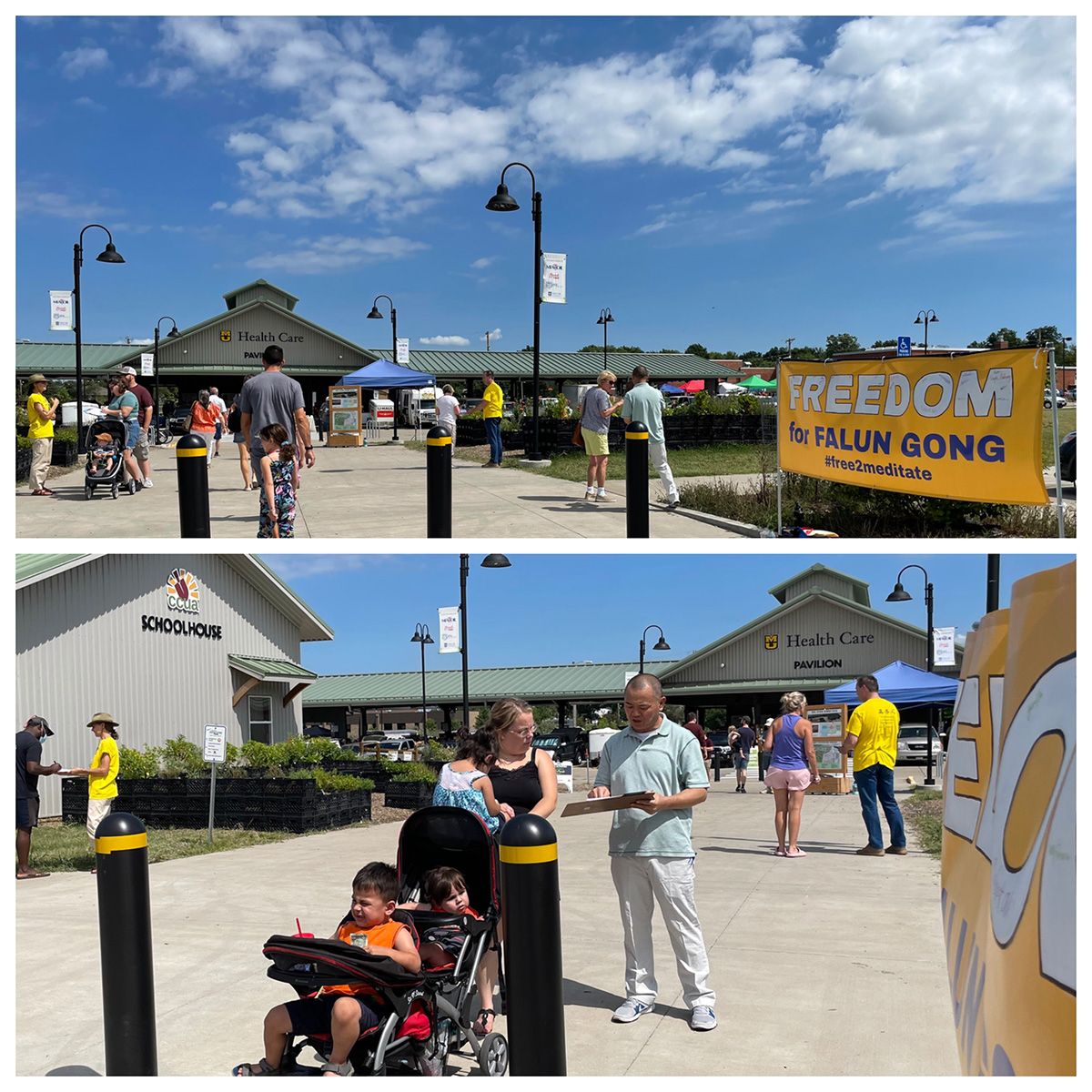 当天,在经历了几周的酷热之后,天气变得宜人。法轮功学员们在农贸市场入口处拉起了“还法轮功自由”的大横幅,许多路人驻足了解法轮功及其在中国遭迫害的情况。不少游客停下来,在敦促制止中共迫害法轮功和活摘器官罪行的请愿书上签名。