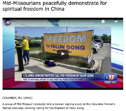 当地电视台ABC-17报道了这次征签活动,报道中突出了学员们在世界范围内为制止迫害所做的努力,以及密苏里州国会议员维姬·哈茨勒和山姆·格雷夫斯对七月二十一日在华盛顿举行的迫害法轮功二十三周年大规模集会的支持。