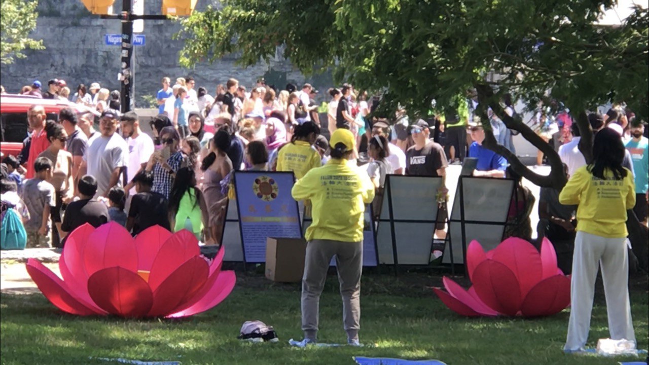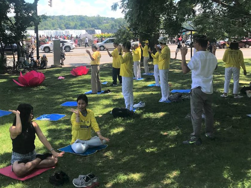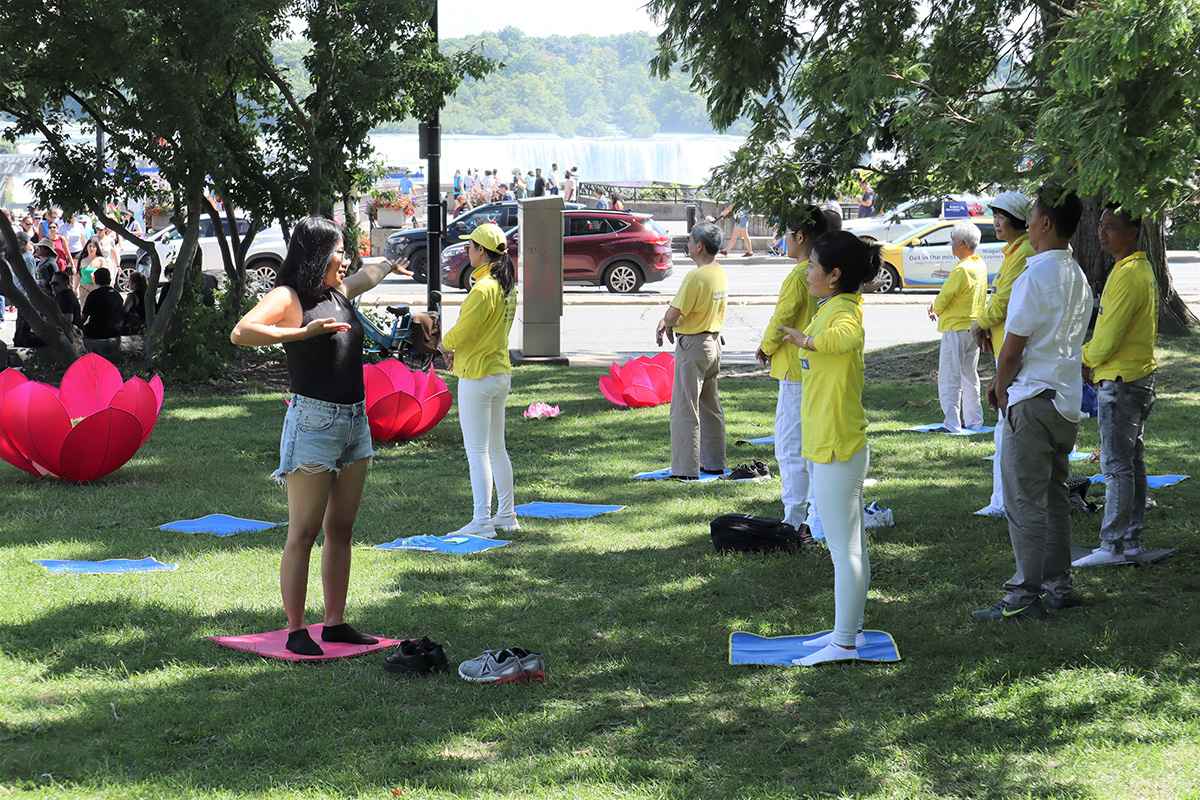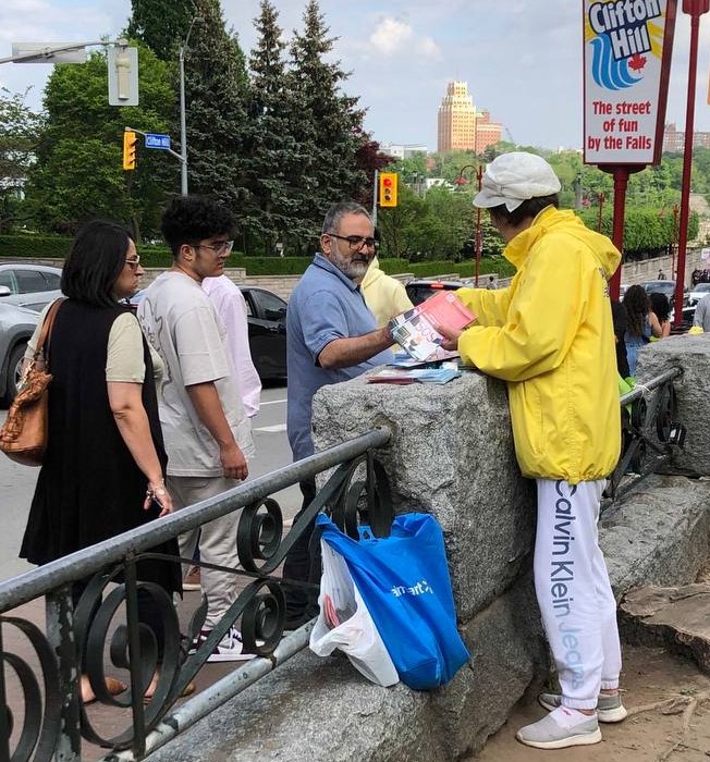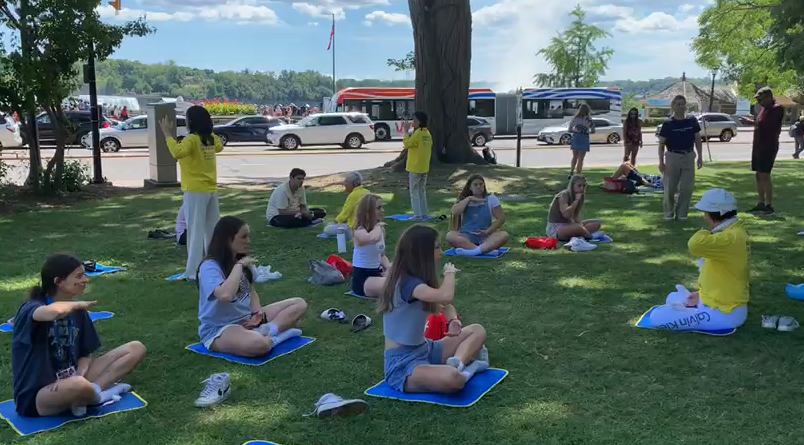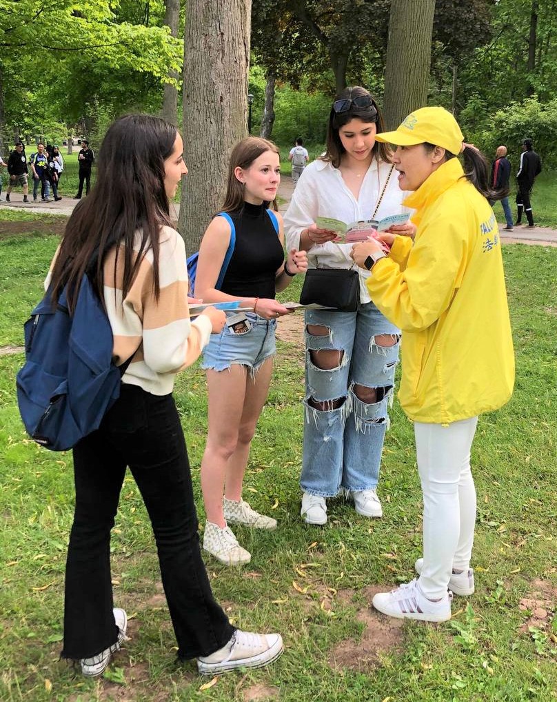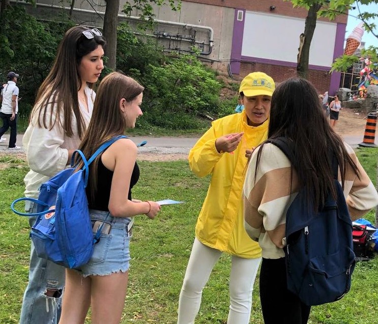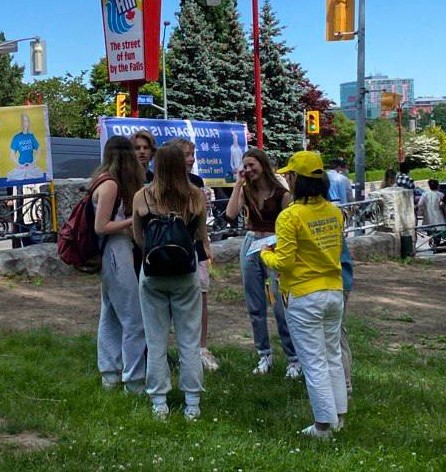 一位秋季要上大学学习心理学的大学生,她是从多伦多北边的萨德伯里市(Sudbury)来到瀑布看到了炼功点,她跟学员交谈了很久,说她对很多人体现象很感兴趣,学员告诉她修炼法轮大法和阅读《转法轮》一书会帮助理解宇宙和人体之谜。