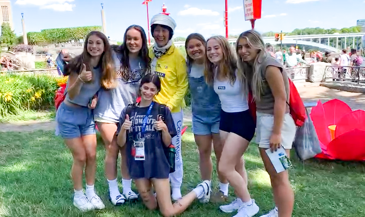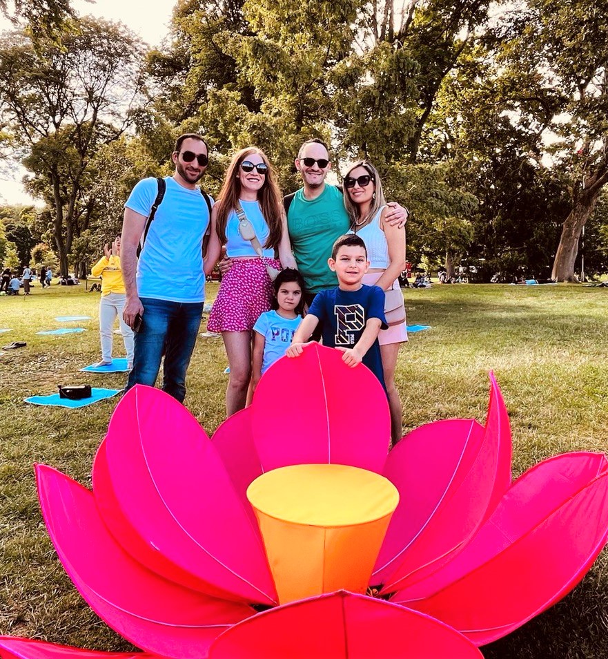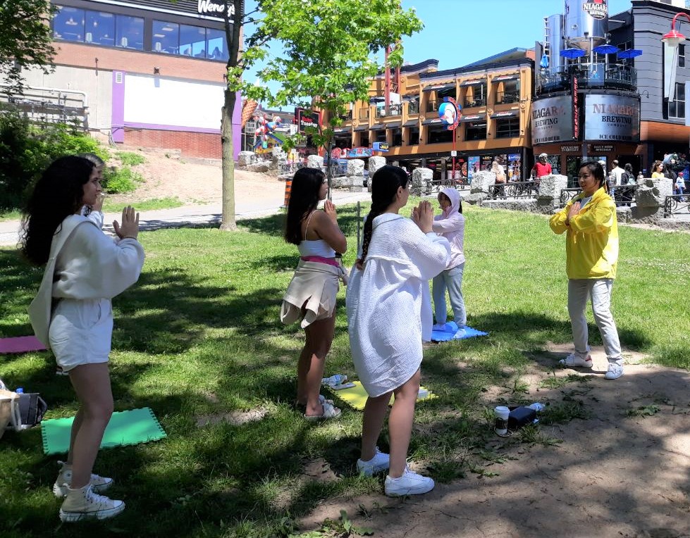看到一位华人女士和女儿坐在台阶上观赏,学员珍妮(Jenny)过去跟她们打招呼:“你们是中国人吗?”女士回答:“是的。来加拿大刚到几天。”