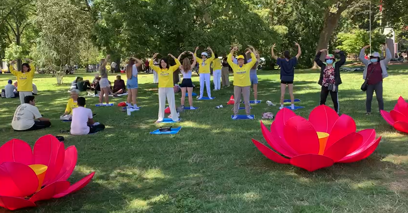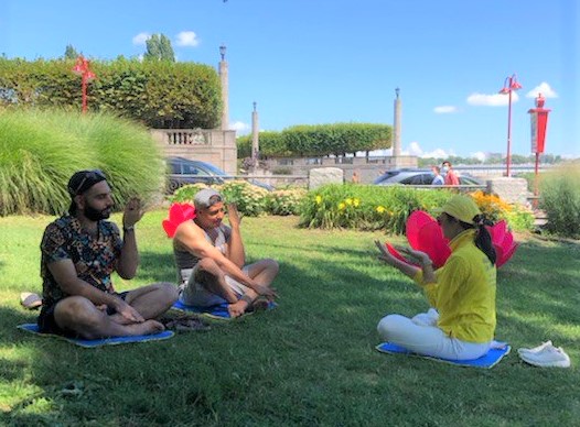 她很认真地把一至五套功法都完整地学了一遍,打坐时非常投入。学完功法,她说:“我就在公园旁一百米远处的卖票点工作,是瀑布旅游局的工作人员。上班时通常都有半个小时的休息时间,平时我是待在办公室里不出来的。今天突然就感觉好像有人带着我走出了自己的办公室,跟着人群来到了这里。”