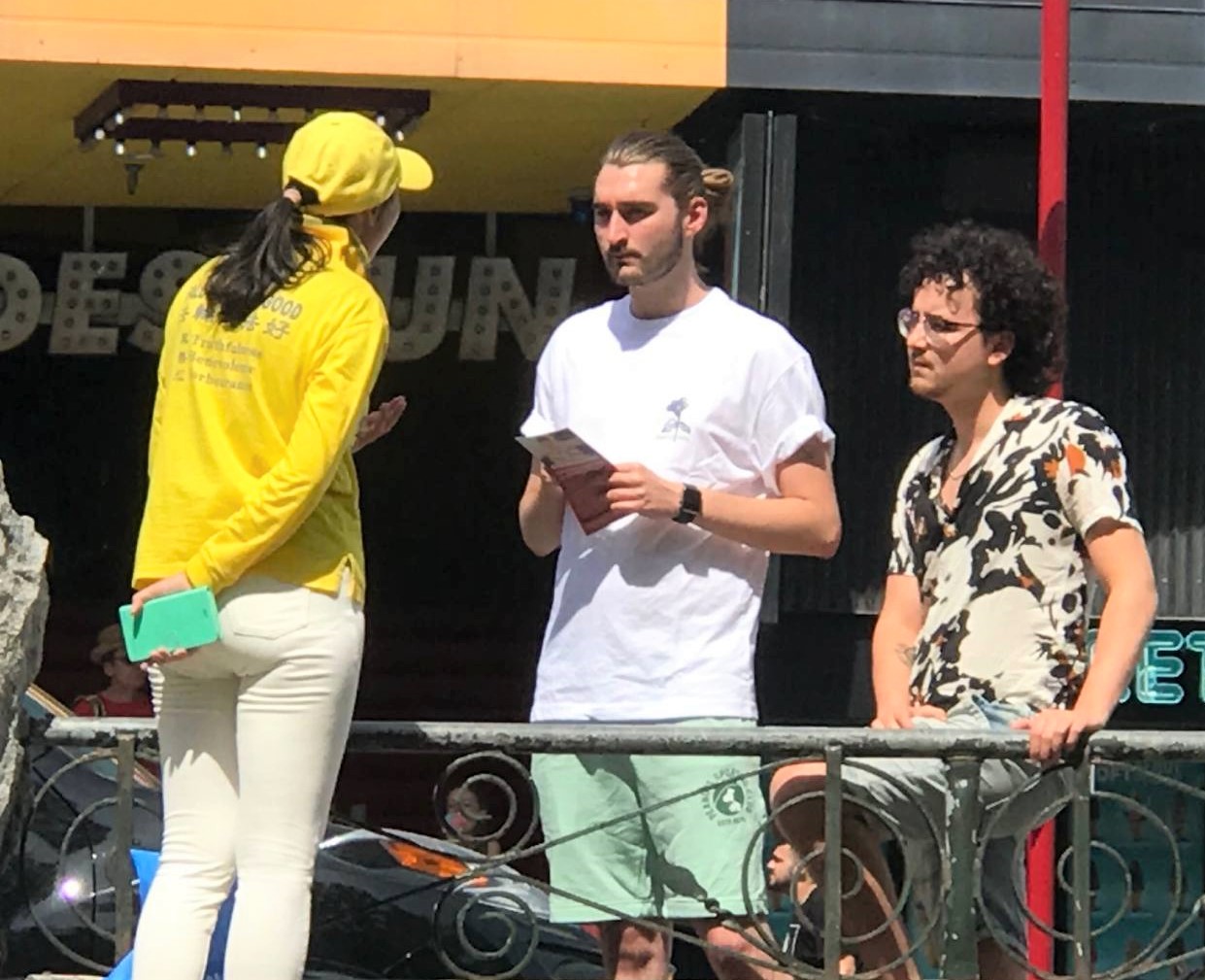 一波波的游客上来听真相、学功,还有来自中国的游客很开心的找到学员做“三:退.”
