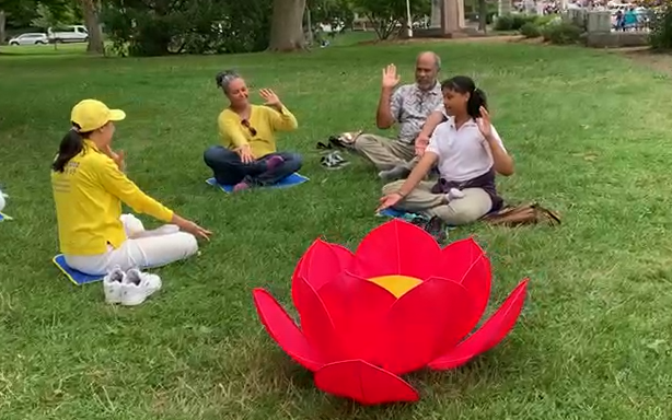 当天大约下午一点半左右,这位女士又来了。她告诉学员:“我叫珍妮弗(Jennifer),想要学炼法轮大法。”
