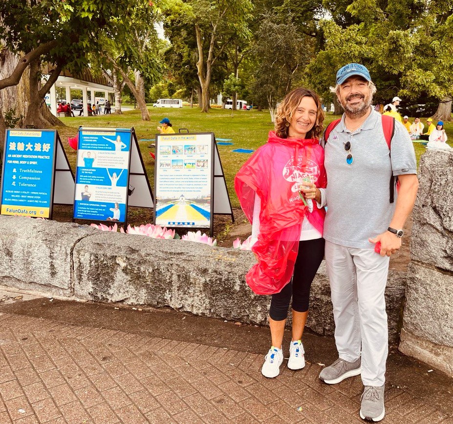 来自意大利的一对夫妇劳拉(Lara)和弗兰克(Frank)很认真地看了展板上的内容,得知真相后,拿着小莲花在炼功点前合影。