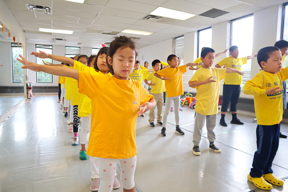 ![]() 图1~2:多伦多明慧学校夏令营的法轮大法小弟子们参加每天的炼功 |
