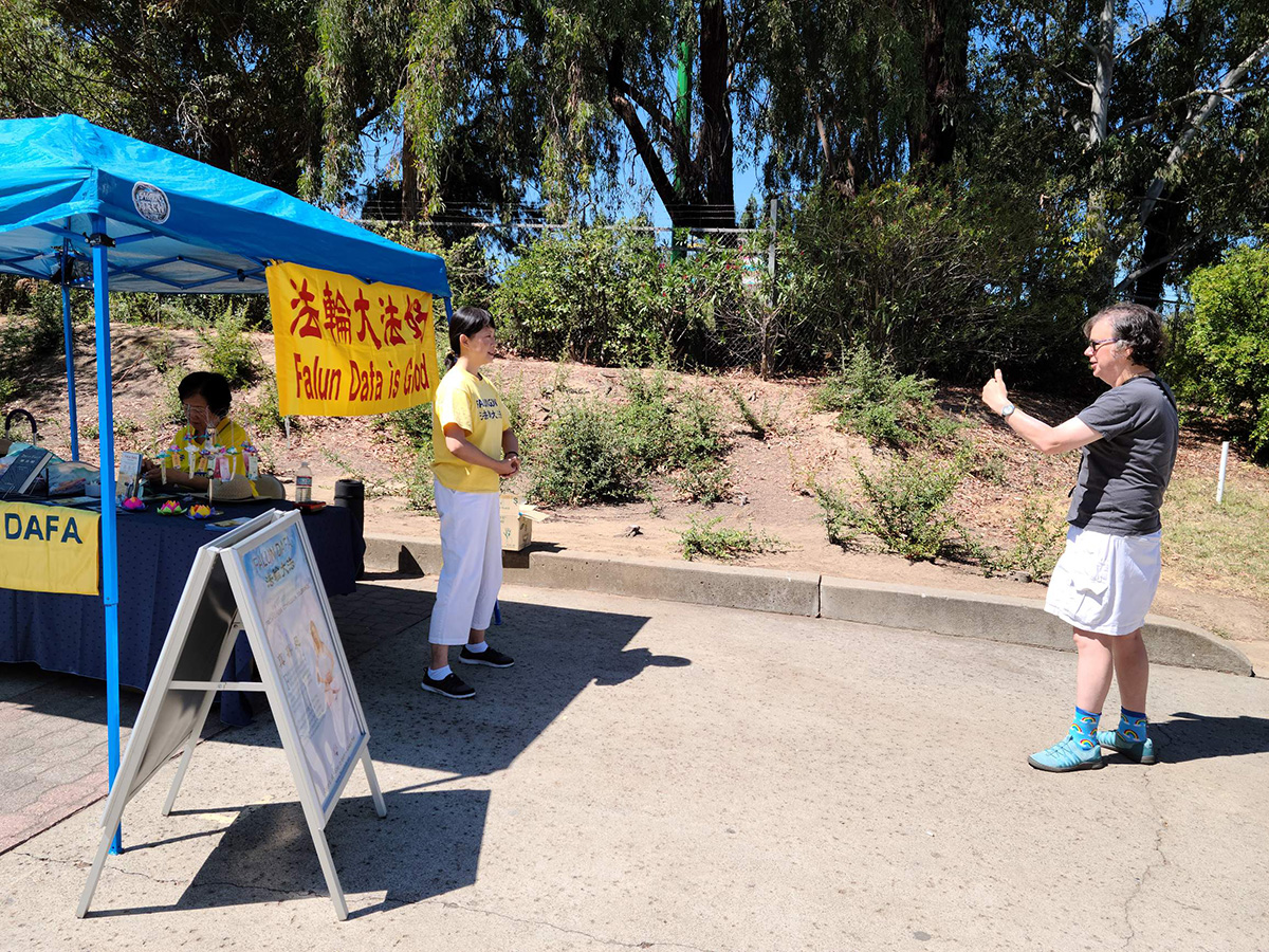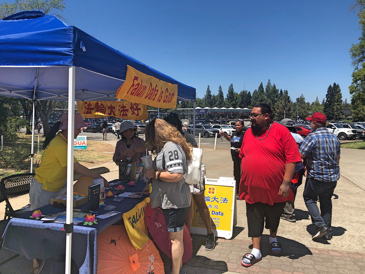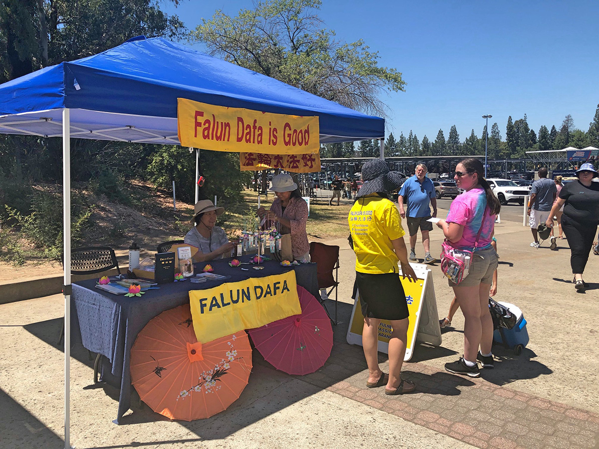 ![]() 图1~2:二零二二年七月的后三周,法轮功学员参加了加州博览会,在入口处设立了摊位,向人们介绍法轮功及其真相,不少人驻足了解。 |