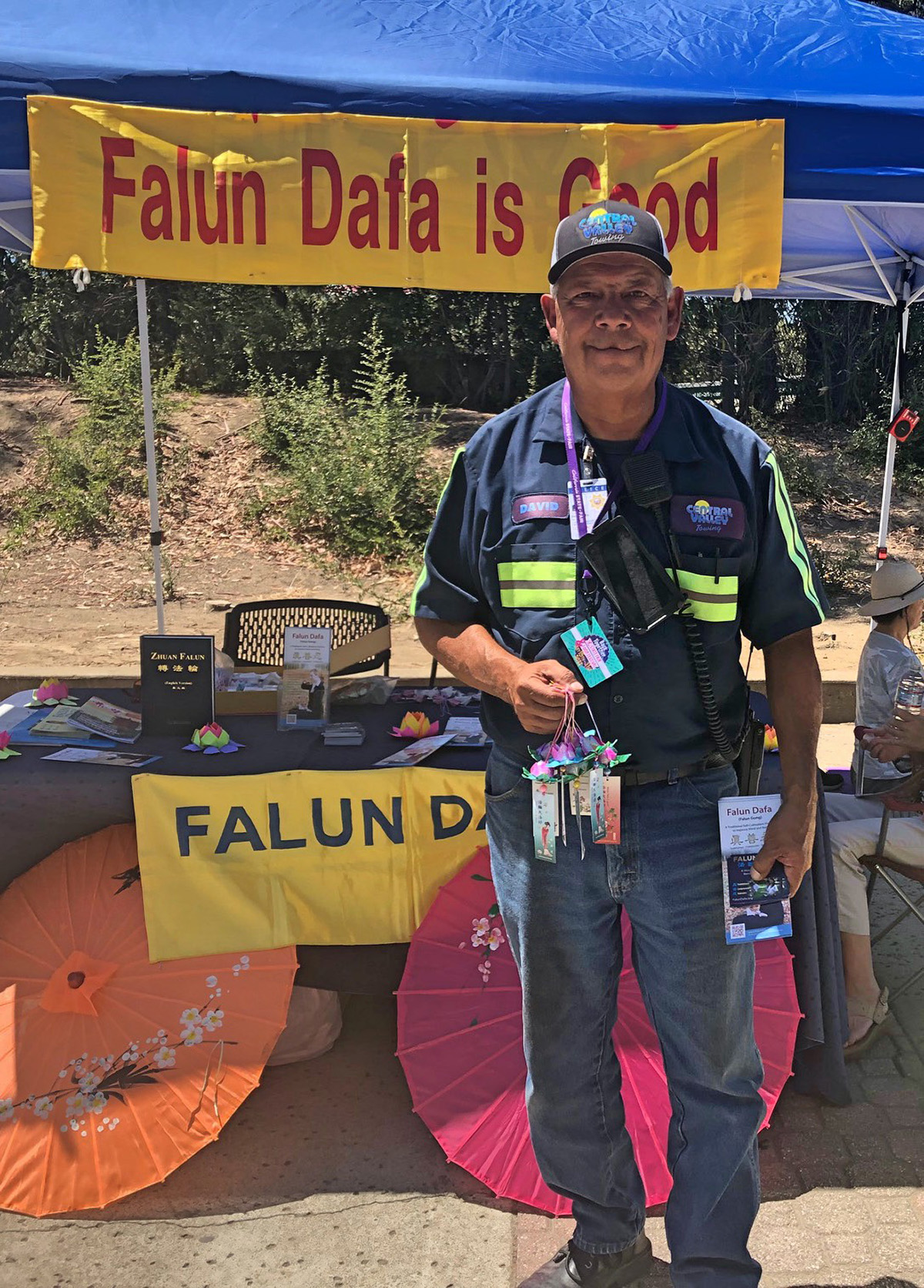 大卫高高兴兴地又拿了一打真相资料和很多小莲花,他觉得这些太好了,他拿去发给需要得到帮助的人。他发完了手上的大法资料就又来摊位上领取更多的,成为这次博览会上传播大法美好的一位特别“使者”。