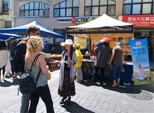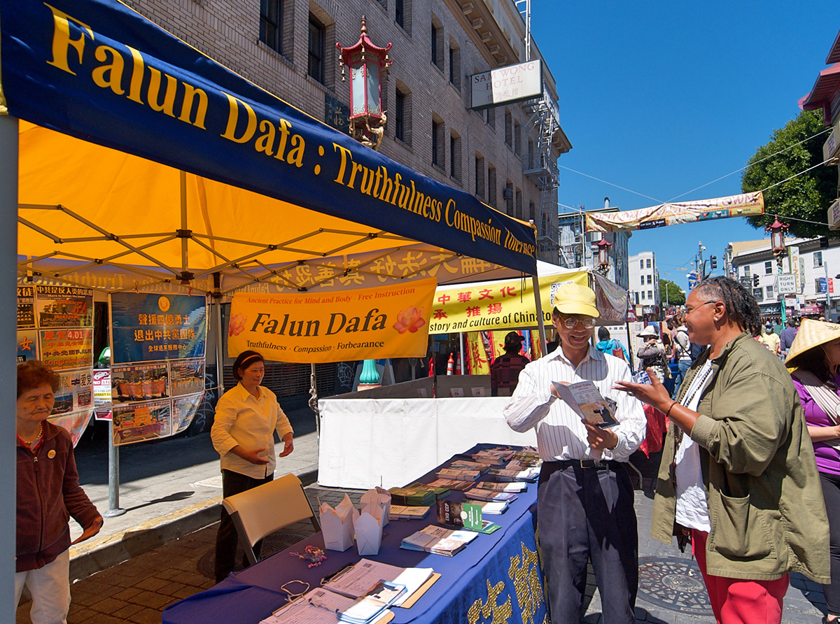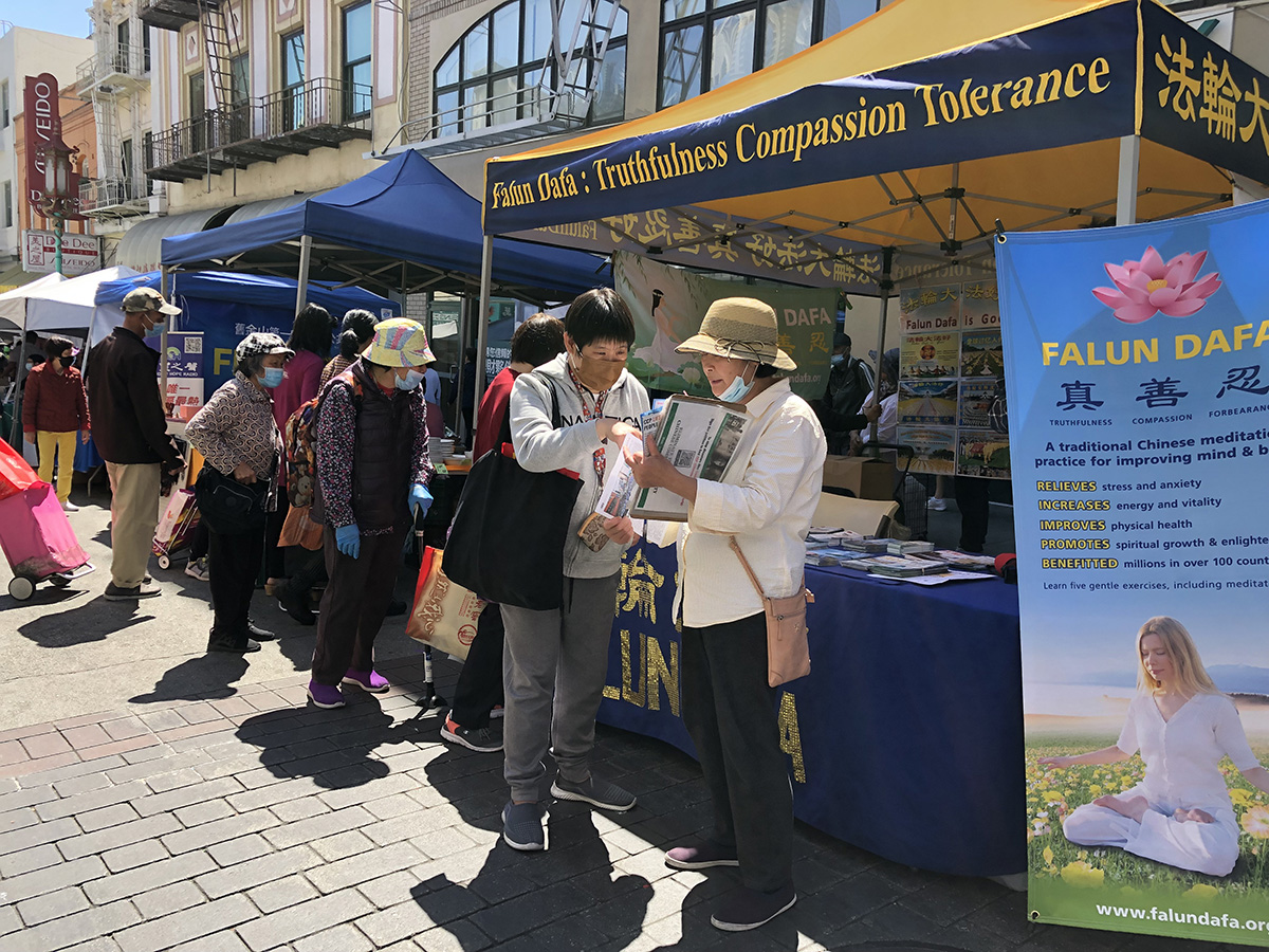 还有一位从中国大陆来的姓江的女士,来到摊位就把摆放在展桌上的资料都看了一遍。学员问她三:退.了没有。她回答:退了。还说:法轮功好啊。学员问她是怎样了解法轮功的。她回答,自己刚从大陆来的时候,对法轮功有疑惑,不相信;但看了《转法轮》后,她才明白原来法轮功这么好。学员问她为什么认为法轮功好。她回答:我看书后,心胸宽广了。我以前跟人斤斤计较,现在不那样了。而且我发现不跟人斤斤计较后,我的心情也舒畅了,人也舒服了。临走前,她拿了最新一期的《天地苍生》杂志,还拿了其他一些真相资料要给她的朋友看。