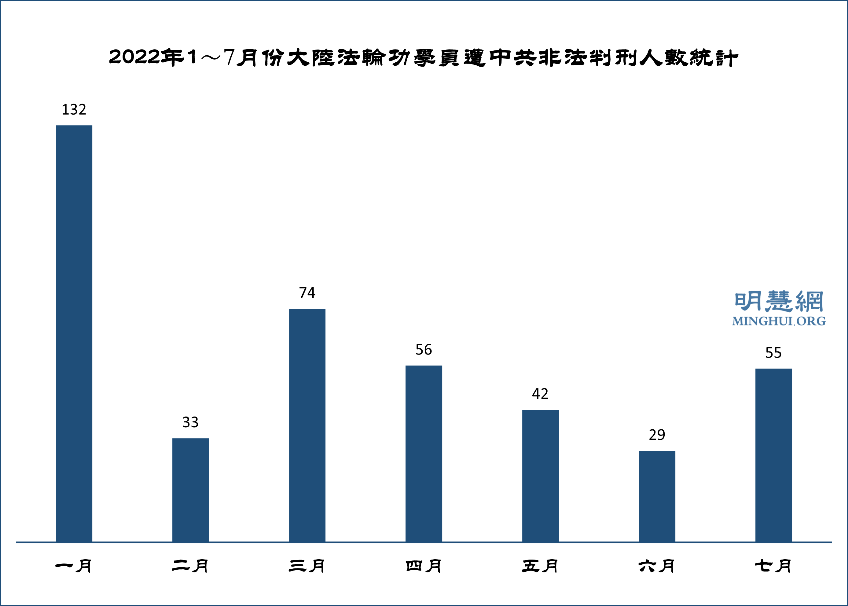 ![]() 图1:2022年1~7月份大陆法轮功学员遭中共非法判刑人数统计 |