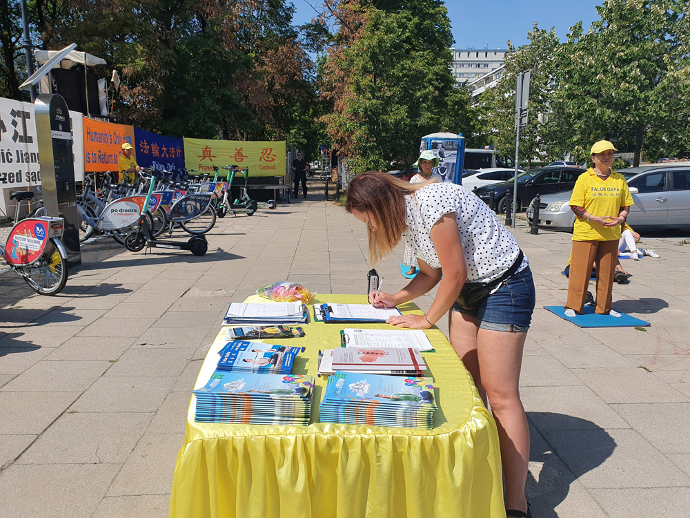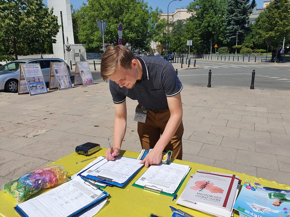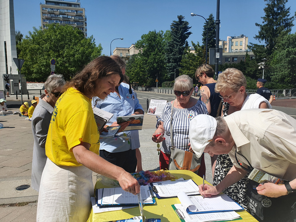 在华沙议会楼前,法轮功学员悬挂出“法轮大法好”、“真善忍”、“停止迫害法轮功”、“法轮大法弘传世界100多个国家”、“法办江泽民”、“回归传统是人类唯一的希望”等横幅,并在人行道旁摆放法轮功真相展板,征签台上放有征签簿、波兰语明慧真相期刊及真相视频等资料。很多过往议员和行人都索取了法轮功传单和资料,并在征签簿上签名支持反迫害。