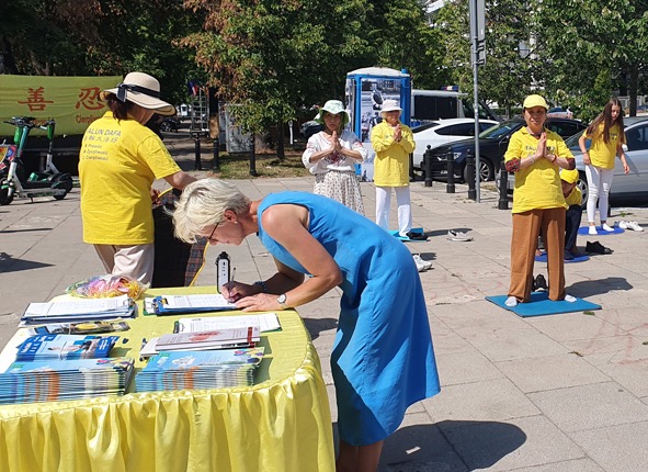 也有很多人看过法轮功真相展板或听到法轮功学员的讲解后,络绎不绝地来到征签台前,在“反活摘”等征签表上签名。不时有人要求与法轮功学员合影留念,更有人紧紧拥抱法轮功学员,感谢法轮大法给人带来的希望和法轮功学员坚持不懈的努力。
